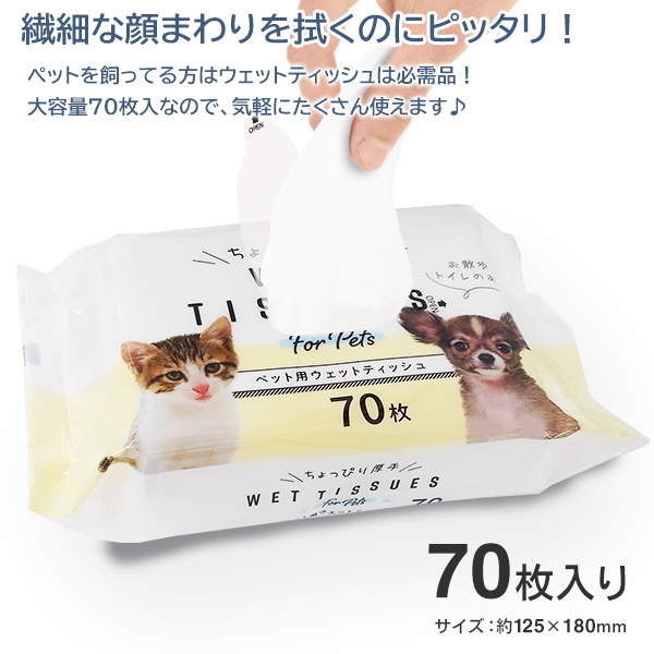 ペット用ウェットティッシュ 除菌シート 70枚入り 厚手 トイレ お散歩 掃除 ついで買い特集【 ペット用品 ウエットシート 拭き取り 足ふき 顔 おしり 犬用 猫用 衛生用品 まとめ買い 】 /60N◇ ペットウェットティッシュ