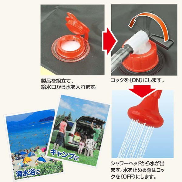 | ※ 使用前に水漏れがないか必ず確認してください。 ※ 本商品は屋外用の簡易シャワーです。運搬用として使用しないで下さい。 ※ シャワーヘッドが本体より下になるよう吊るしてご使用ください。寝かした状態ではうまく水が出てきません。 ※ 水量が少ない場合やホースが折れ曲がっていると水の流れが悪くなります。 ※ 太陽光で温水のシャワーを使う場合、使用環境や気温により水温は異なります。 ※ 飲み水用としては使用できません。 | |