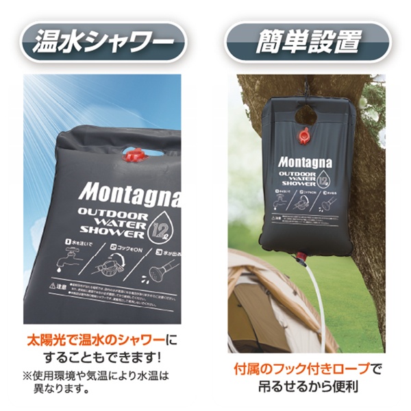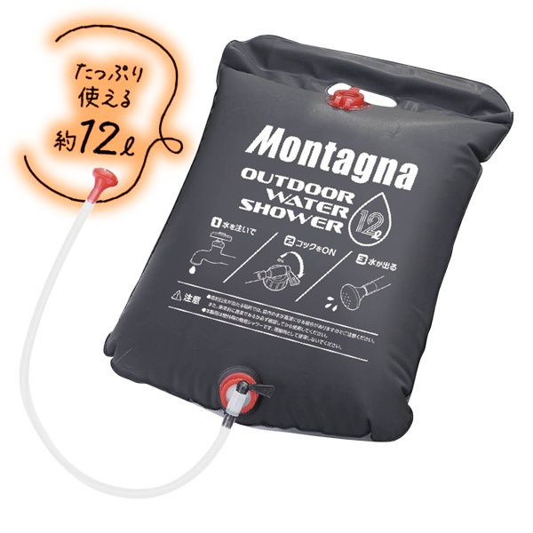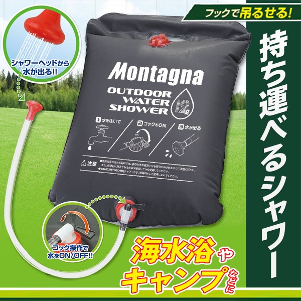 送料無料 ! ポータブルシャワー 電源不要 12リットル 吊り下げ アウトドア 簡易シャワー Montagna モンターナ【 水タンク 断水 ウォータータンク 海水浴 キャンプ 防災グッズ 散水 1500円 以下 の商品】 送料込 ( 日本郵便 ) ◎ 60N◇ NEWアウトドアシャワー