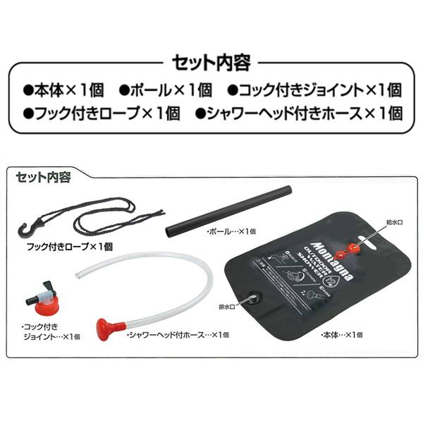 | セット内容 | 袋本体/フック付きロープ/ シャワーヘッド付きホース/ コック付きジョイント(各1個) |