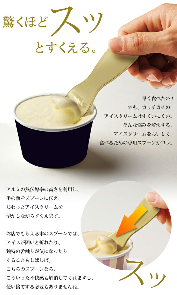 アルミの熱伝導率の高さを利用し、手の熱をスプーンに伝え、じわっとアイスクリームを溶かしながらすくえます。