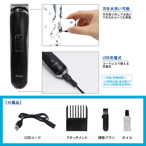 コードレスバリカン USB充電式 メンズ ヘアカッター 長さ5段調節 アタッチメント付き 刃は水洗いOK 【 電動バリカン 散髪 軽量 スリム 電気バリカン 美容家電 男性用 セルフ 刈り込み 刈り上げ 】 /60N◇ バリカンM43