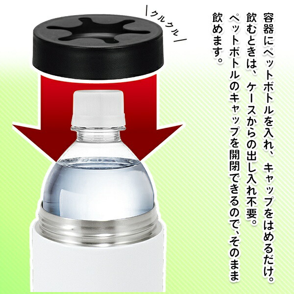 500mlのペットボトルをまるごと保冷・保温! 中の飲料を他の容器にうつす手間はありません。 ペットボトルをそのままケースに入れて保冷・保温ができます。 ペットボトルを入れ、キャップをはめるだけ。 冷たい飲み物も、温かい飲み物も飲み頃をキープできます。 飲むときは、ケースから出す必要はありません。 ペットボトルの蓋を開けて、そのまま飲むことができます。 ストラップ付の便利なメッシュポーチが付属。 フックで吊るしたり、カラビナを使えばベルトループにつけたりできます。 ※ フックやカラビナは付属しません。別途ご用意ください。 近くに置いておいたり、肌身離さず持っておけば、こまめに水分補給ができるので安心♪ シンプルなデザインで、性別・年齢問わず、オールラウンドに活躍。 自宅ではもちろん、オフィスにもアウトドアにもぴったり。 |