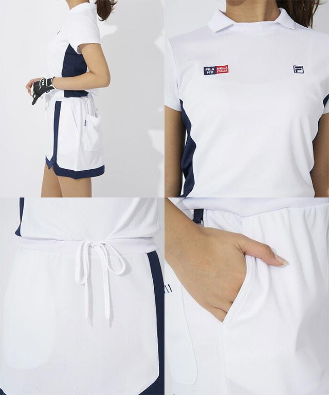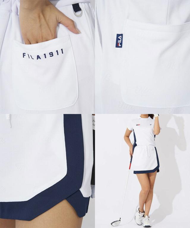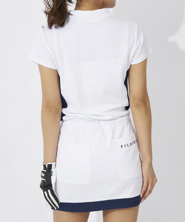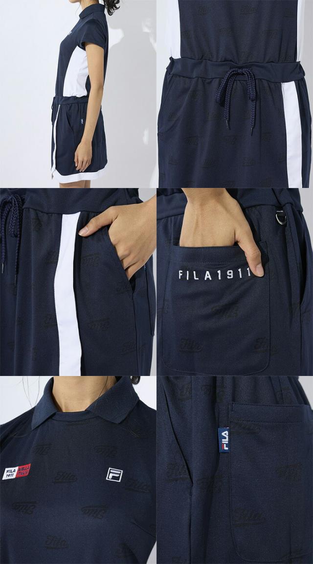 前ボタンを止めるわずらわしさがない、スキッパータイプのワンピース。スッキリと見えるバイカラーのサイドラインがポイントに。また、筆記体FILAのロゴをランダムにジャガードで表現した、ストレッチ性の良い素材を採用しております。