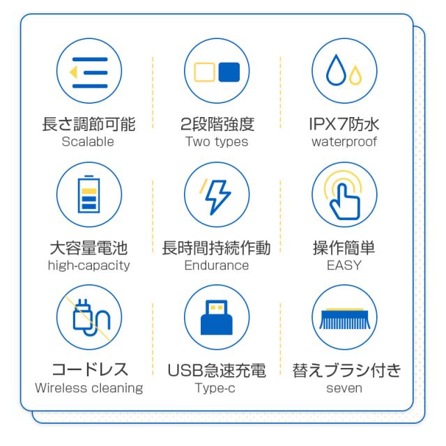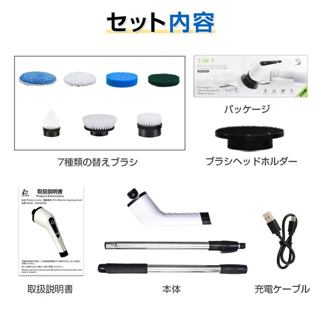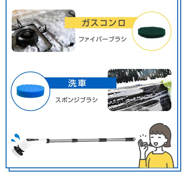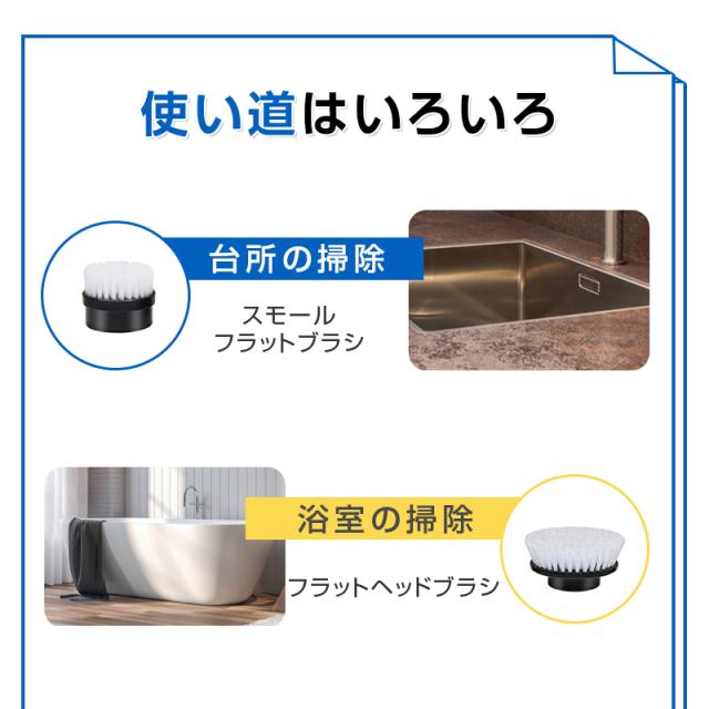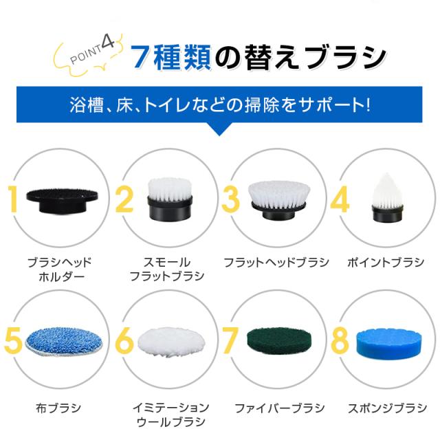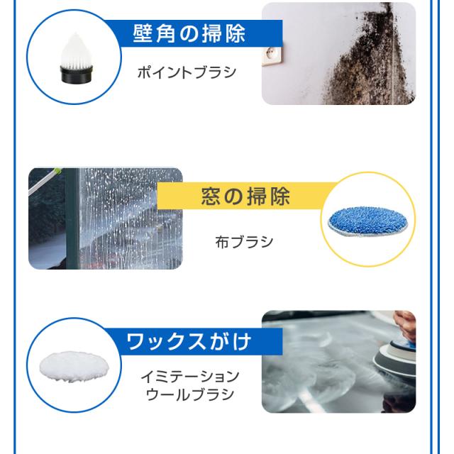 【7種類の替えブラシ】使い分け可能な7種類のブラシを付属しており、清掃したい所によって、最適なブラシを選んで効果的な掃除ができます。お風呂の掃除だけでなく、キッチン、洗面所、玄関、窓、天井、台所、床など、掃除しにくい場所や汚れが落ちにくい箇所まで様々な場所に使用できます。