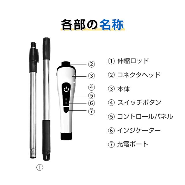 【長さ調節可能】清掃距離によって、延長ハンドルの取り付け、取り外しを通して、長さを自由に調節できます。お風呂場の浴槽や床などの腰をかがむ必要がある箇所の短距離掃除に適用します。また、天井や壁などの磨きにくい箇所も伸縮ロッドを伸ばすことで長距離掃除に適用しています。