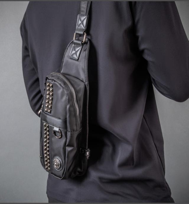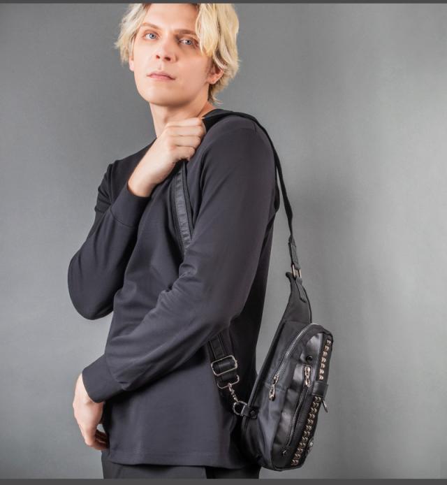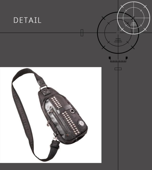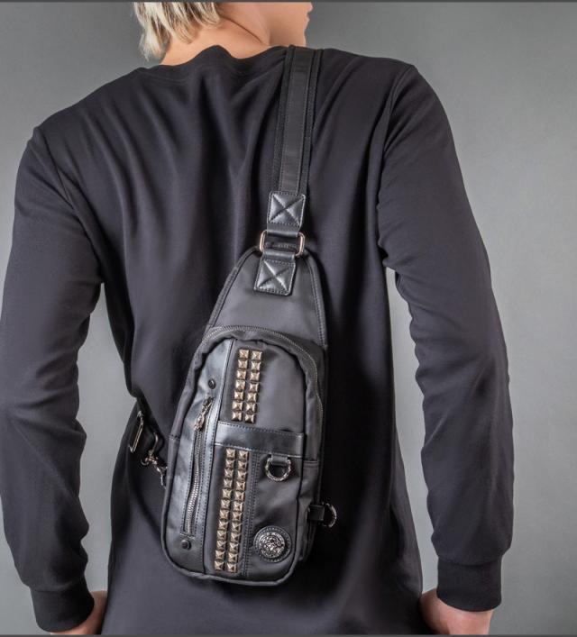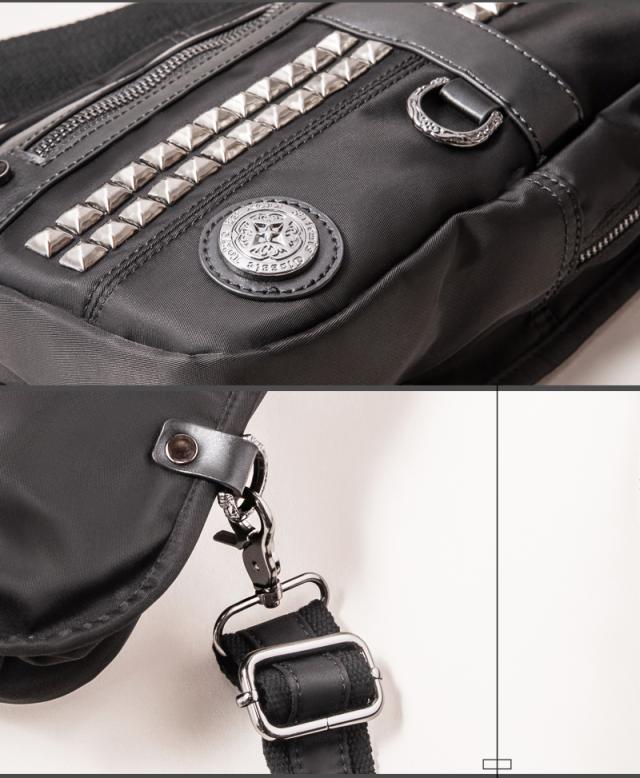 | 仕様 | 普段のお出掛けにピッタリな容量のナイロンのボディバッグ。ピラミッドスタッズがお洒落なポイント。出し入れに便利な小物収納が2ヶ所。左右どちらでも肩掛けしやすい様に、ストラップの取り付け位置が変更出来る仕様で、ボディラインにジャストフィットします。メイン生地は防水加工を施したナイロン生地を使用。 |