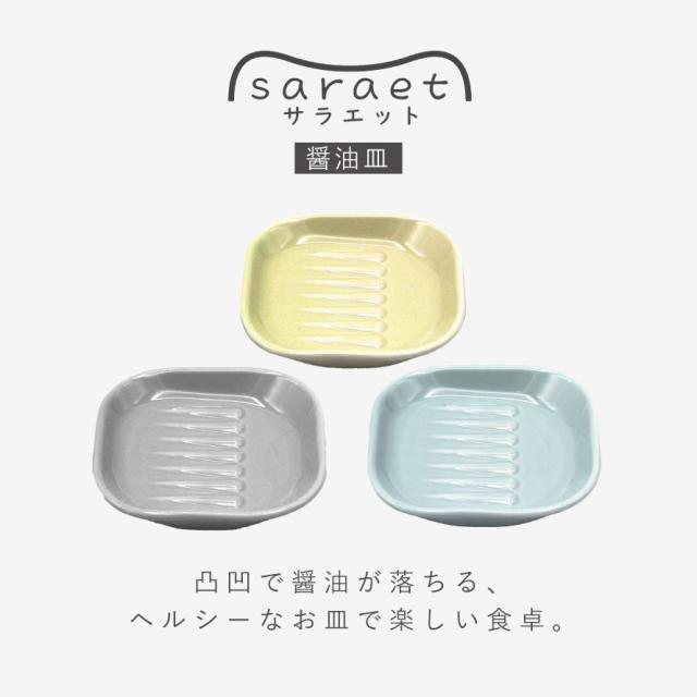 醤油皿,しょうゆ皿,しょう油皿,食器,磁器,食洗機対応,食洗機,レンジ対応,電子レンジ,レンジ,おしゃれ,お洒落,オシャレ,かわいい,可愛い,北欧,シンプル,モダン,キッチン,ギフト,プレゼント,カフェ,インスタ映え,カフェ風,パーティー料理,ホームパーティー,おもてなし,料理,盛り付け,ブルー,イエロー,グレー,パステルカラー,サラエット,saraet,溝,塩分,減塩,ヘルシー,健康,スリット,凸凹,