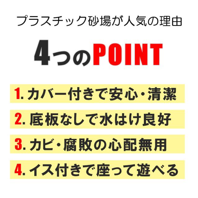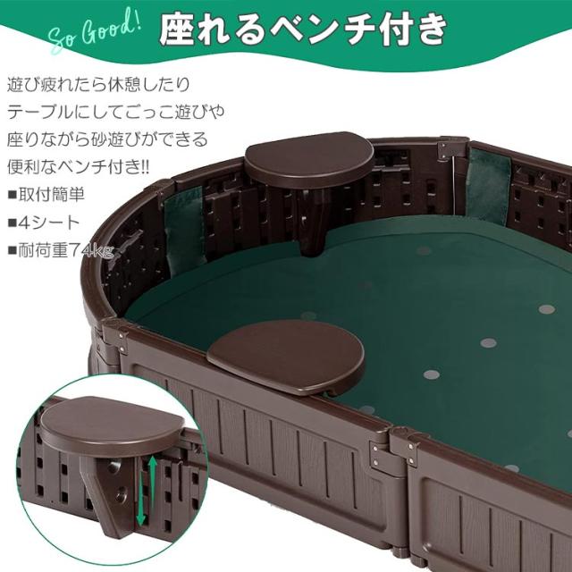 動物から砂場を守るカバー付き 座って遊べる椅子付き 遊んでいない間に動物に砂場を 荒らされてしまったり、 風で砂が舞ってしまうのを防ぐ カバーが付属します。 砂場の縁にはベンチ付きで座って遊ぶ事ができます。 砂遊びが終わる頃にはガーデニングを楽しむ花壇としてもお使いいただけます。 ※砂・おもちゃ等は付属しません |