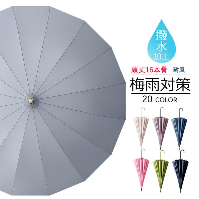 【20色展開】長傘 レディース 雨傘 メンズ ワンタッチ長傘 大きめ 梅雨対策 耐風 無地和風傘 撥水加工 頑丈16本骨 マカロン