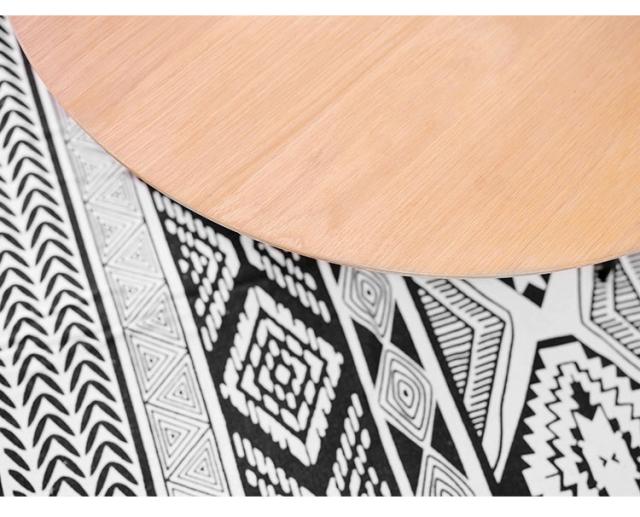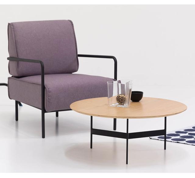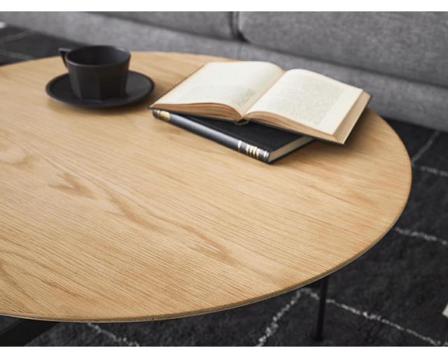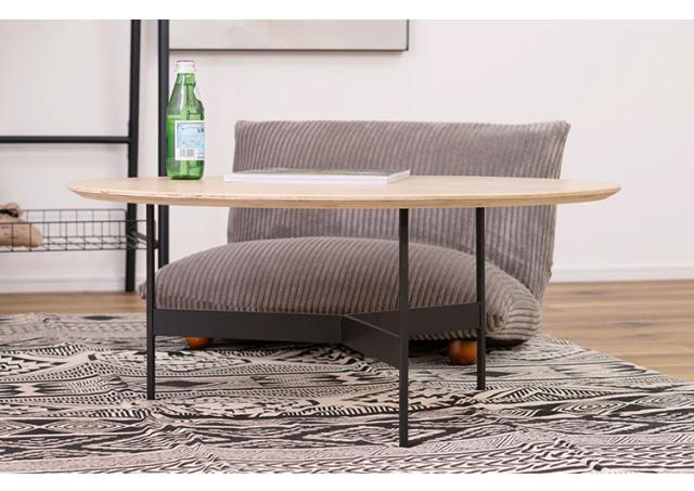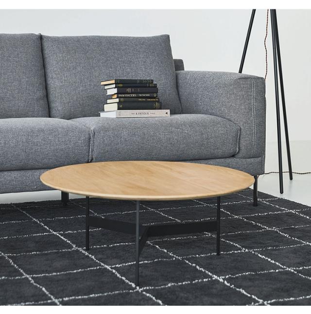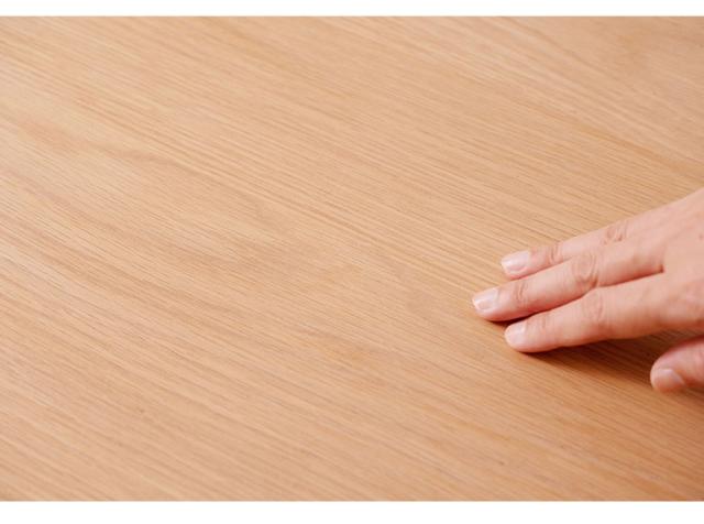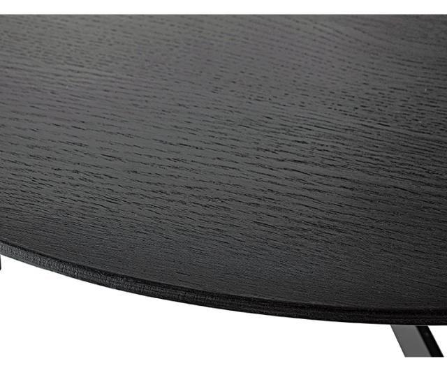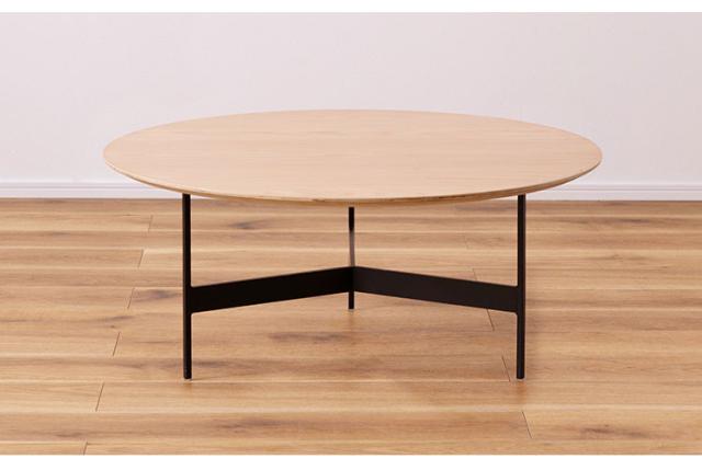 天板には重厚感のあるオーク突板を使用し、脚部は異素材のマットな質感のブラックアイアンレッグを組み合わせています。