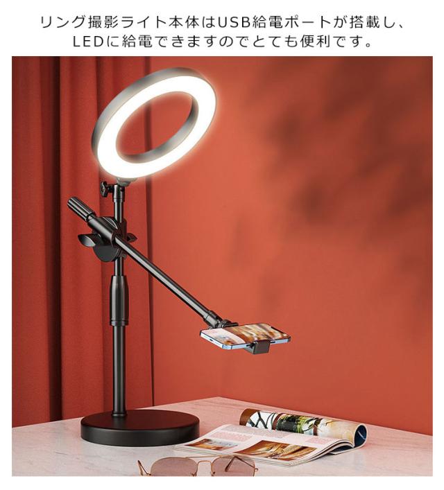 俯瞰撮影 LEDリングライト スマホスタンド 伸縮 3色モード 真上から撮影 手元撮影 スマホ 動画撮影 料理動画 撮影照明用 手元を映す アート お料理 ライブ配信 オンラインレッスン USB 接続 自撮り