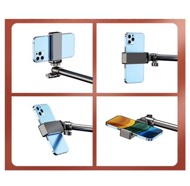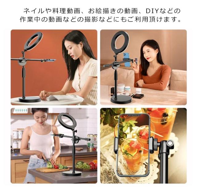 | スマホの固定は、縦横どちらの向きにも装着可能で、角度も向きも自由自在です。 高輝度LED電球を採用し、3色の照明モード機能(白、黄、暖)が付属しており、卓上の照明撮影用に最適。 ネイルや料理動画、お絵描きの動画、DIYなどの作業中の動画などの撮影などにもご利用頂けます。 360度の角度調整が可能で、横、縦、斜め、上下、自在に好きな位置にスマホをセットできます。 リング撮影ライト本体はUSB給電ポートが搭載し、LEDに給電できますのでとても便利です。 | |