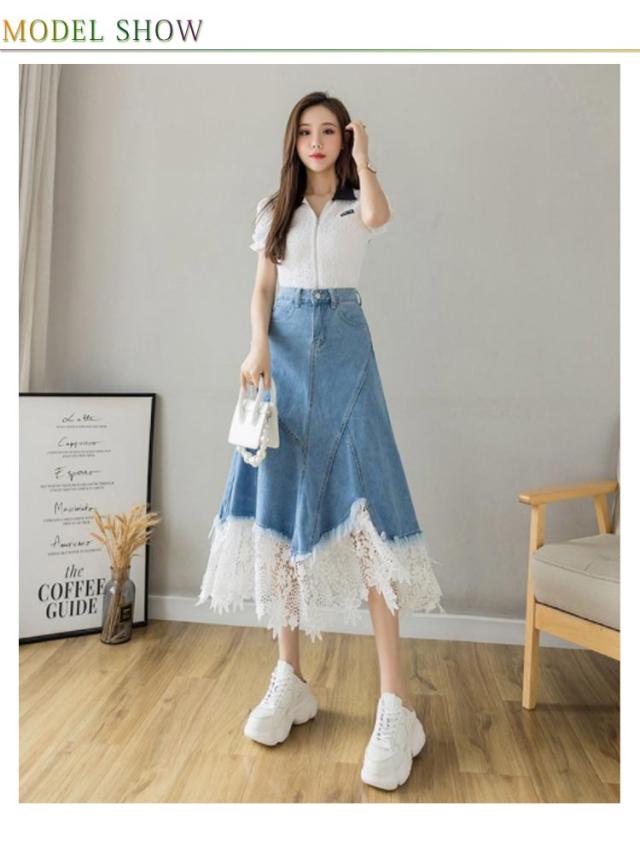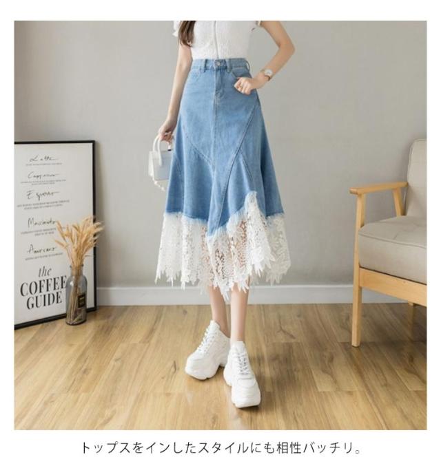 送料無料 デニムスカート 春夏 レース 切り替え レディース ハイウェスト レース切り替えスカート Aラインスカート 美脚 カジュアル オシャレ アシンメトリー 着痩せ 体型カバー フェミニン S M L XL 2XL