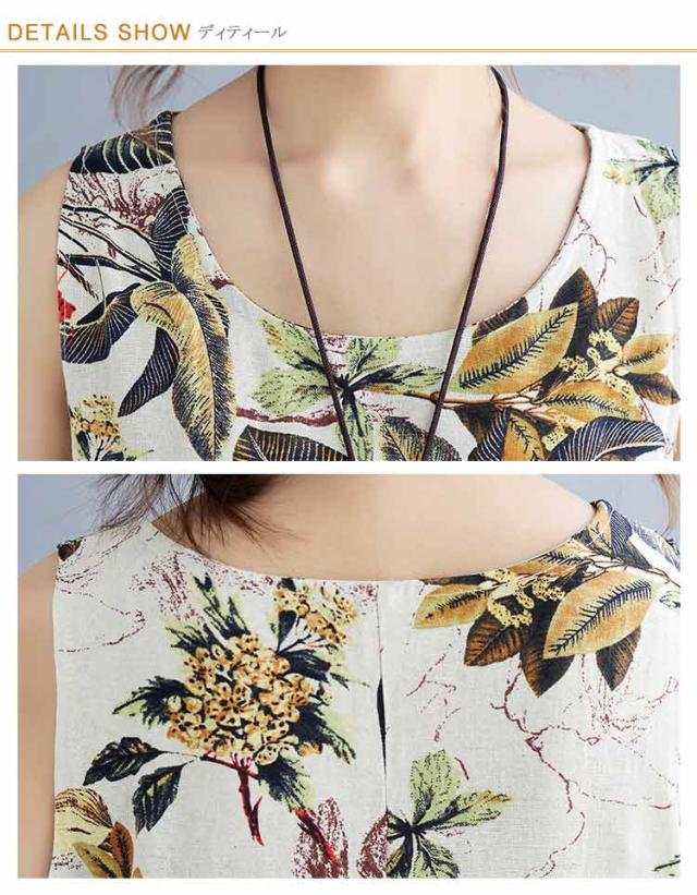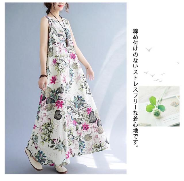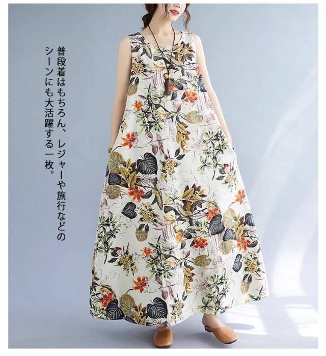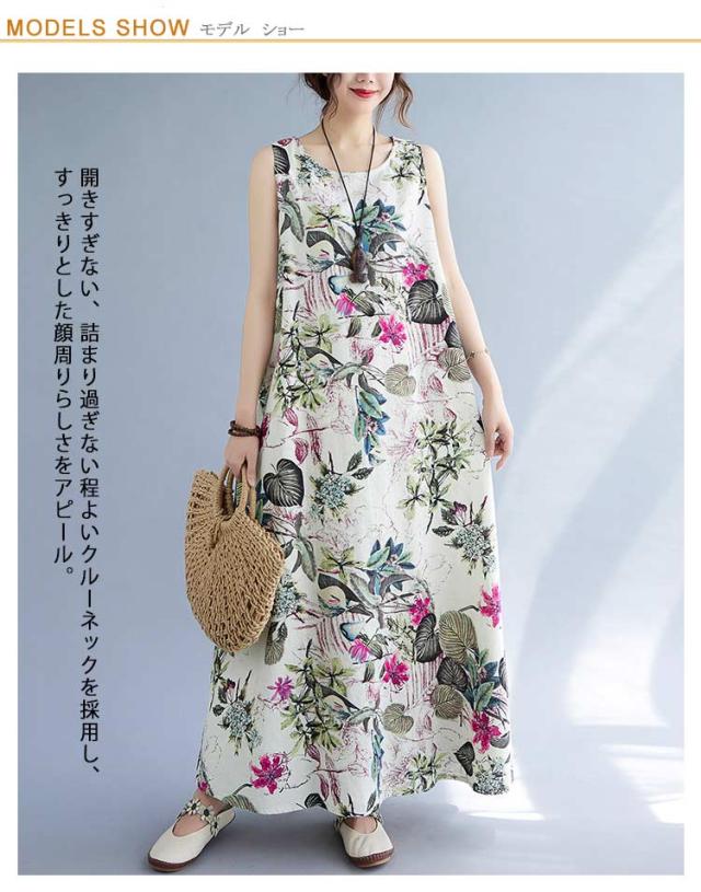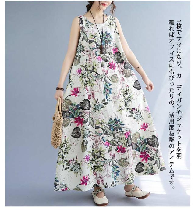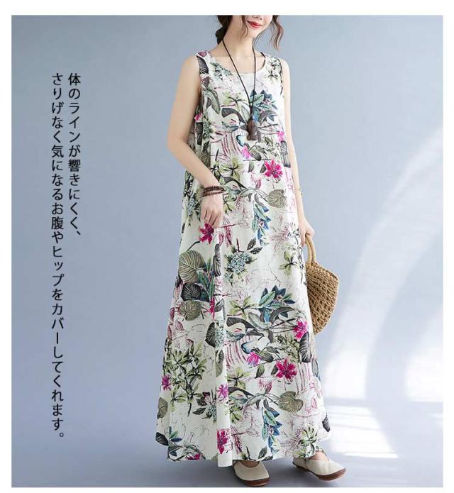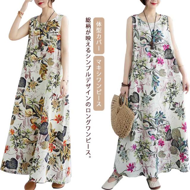 花柄ワンピース マキシワンピース 送料無料 リゾートワンピース ロングワンピース 花柄 レディース ワンピース ロングワンピ ノースリーブ キャミソールワンピース クルーネック 綿麻 春夏 ロング リネン マキシ丈 大きいサイズ 体型カバー