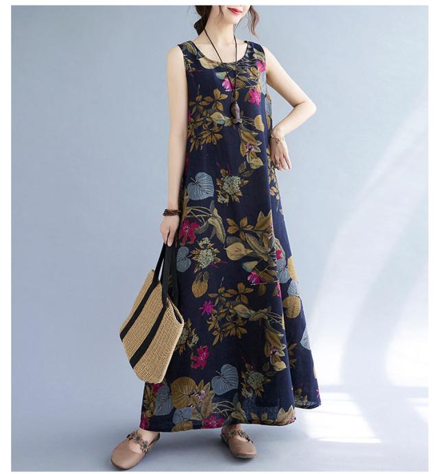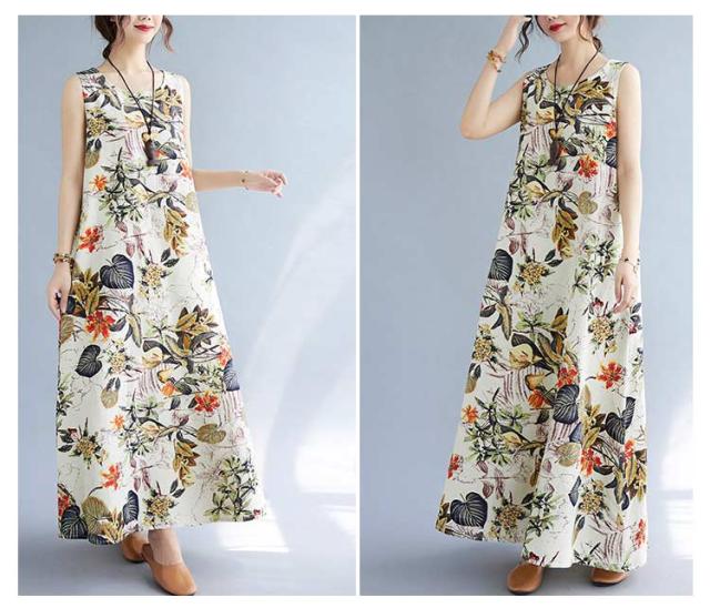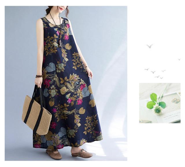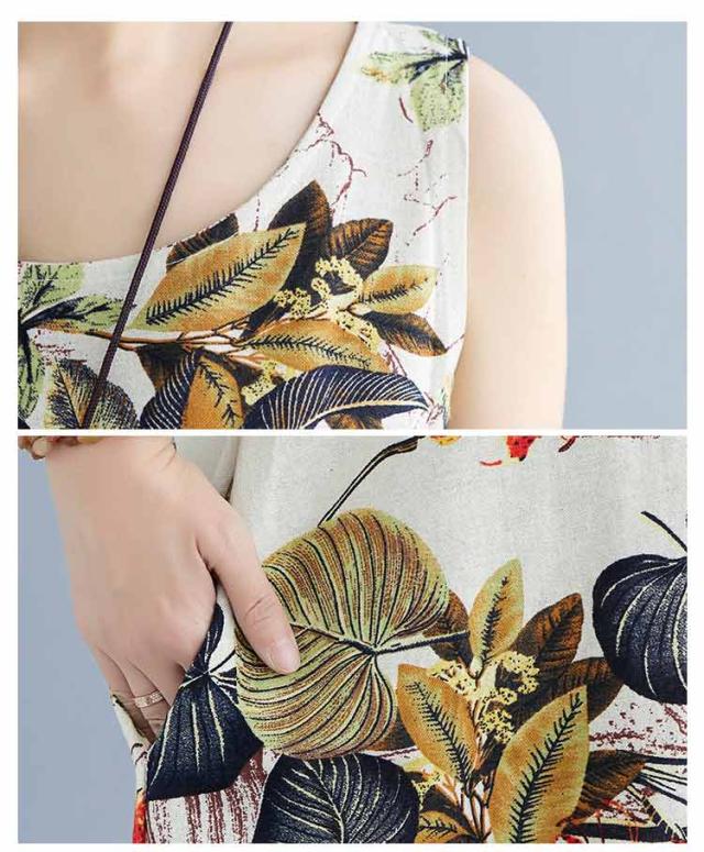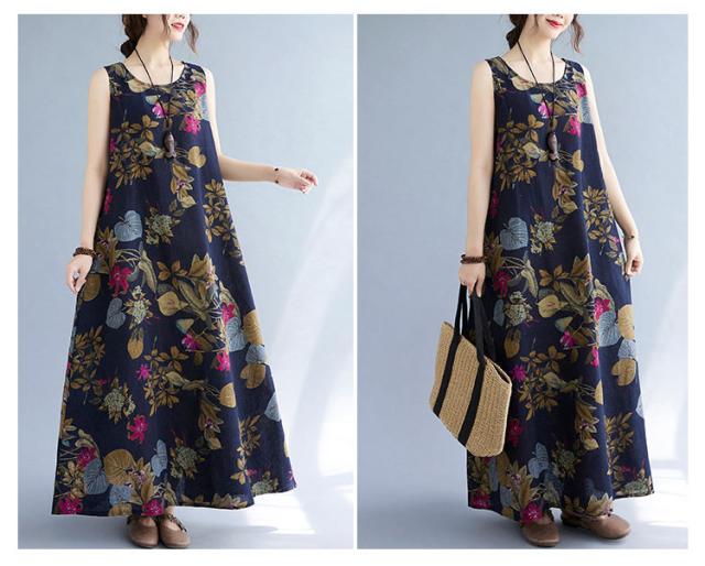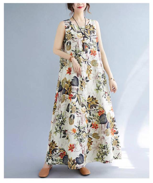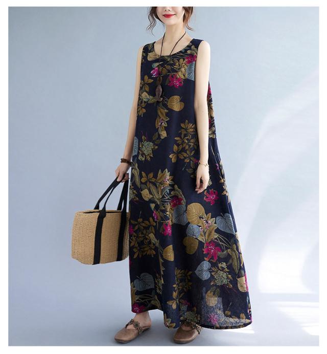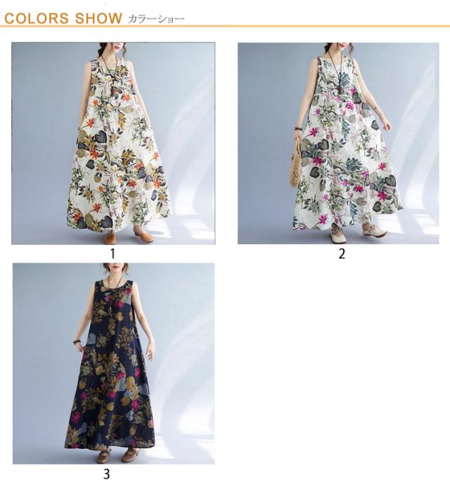 花柄ワンピース マキシワンピース 送料無料 リゾートワンピース ロングワンピース 花柄 レディース ワンピース ロングワンピ ノースリーブ キャミソールワンピース クルーネック 綿麻 春夏 ロング リネン マキシ丈 大きいサイズ 体型カバー