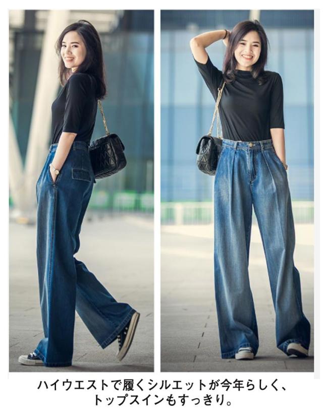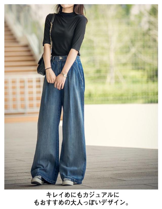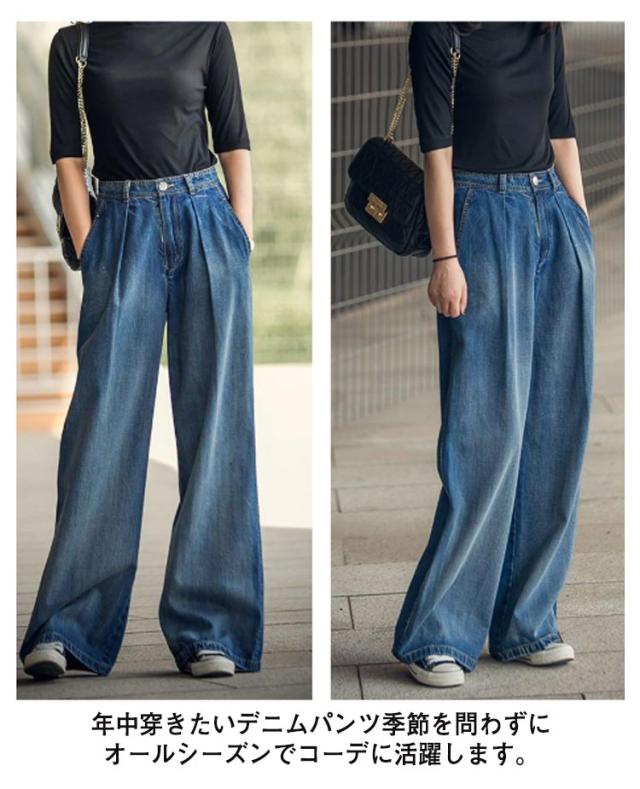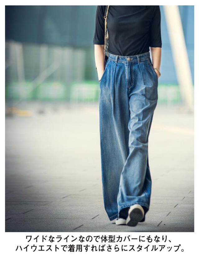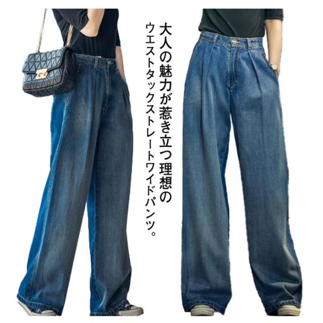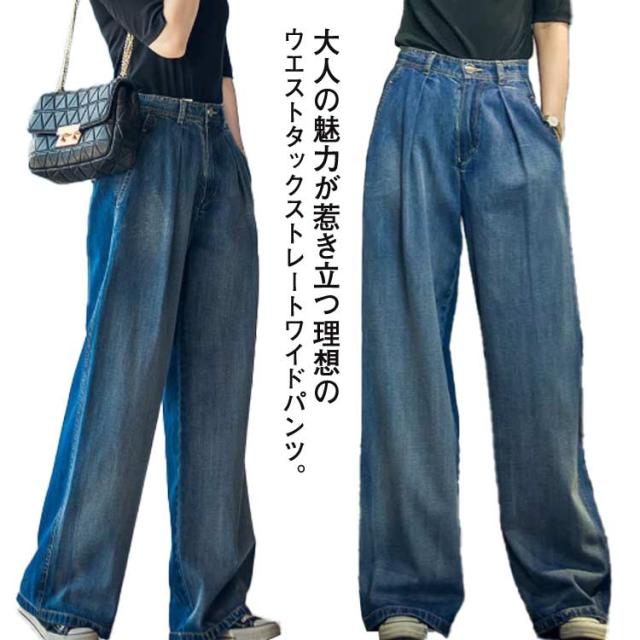 ワイドパンツ デニムパンツ レディース ストレート ウエストタック ズボン ロングパンツ ハイウェスト ボトムス ジーンズ きれいめ 体型カバー 着痩せ 通勤 通学 お洒落 ゆったり 大人 可愛い 大きいサイズ 春 秋
