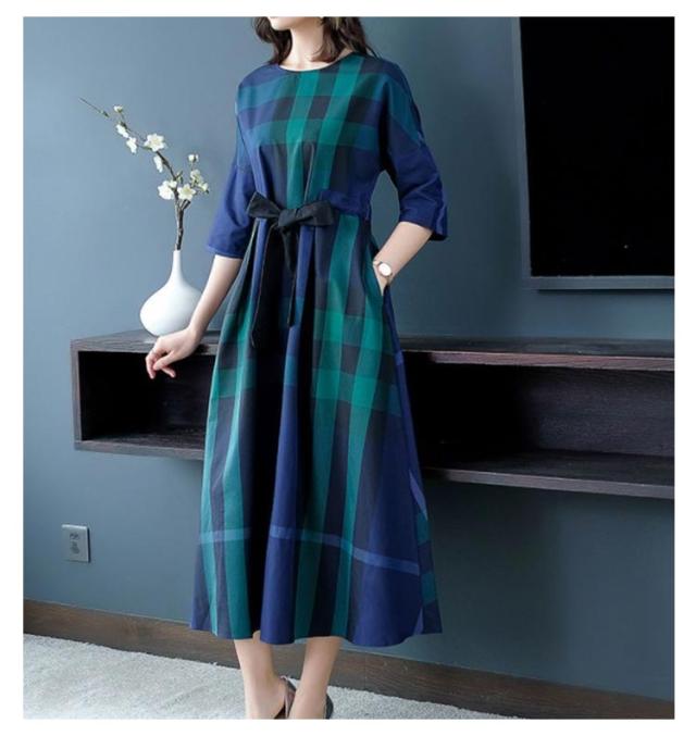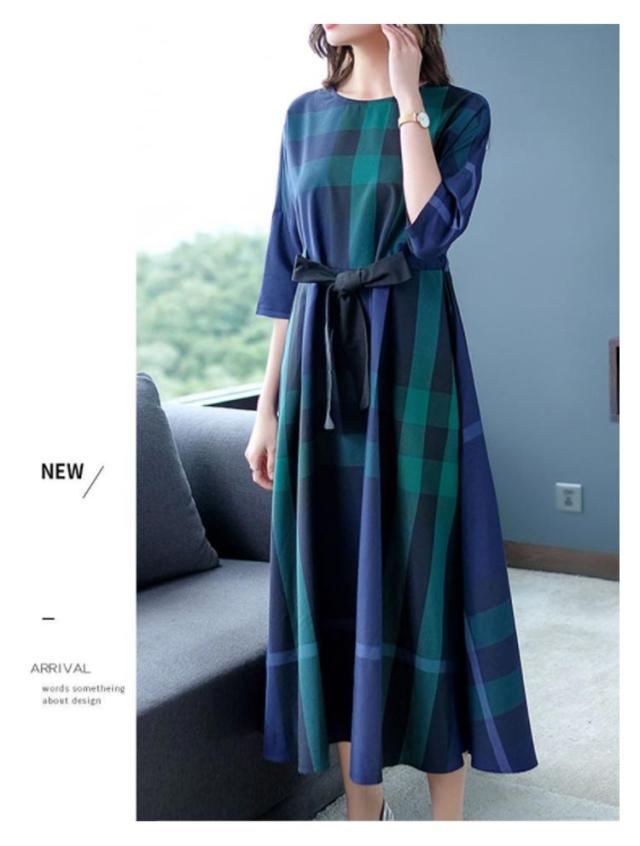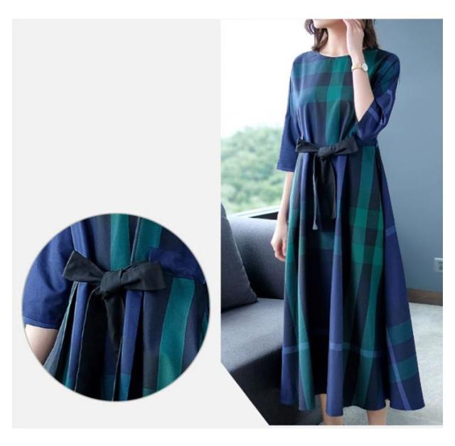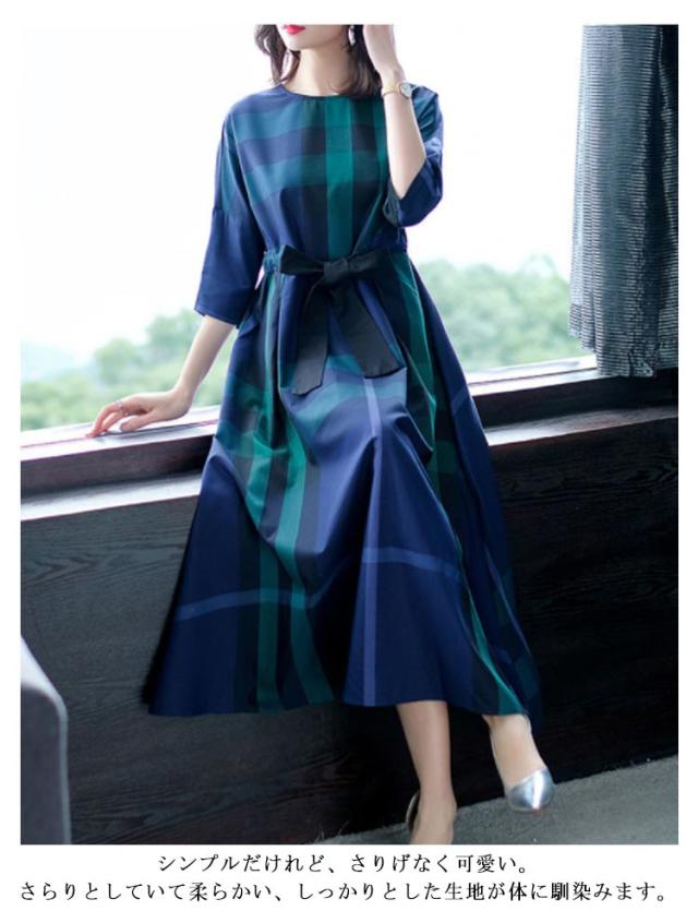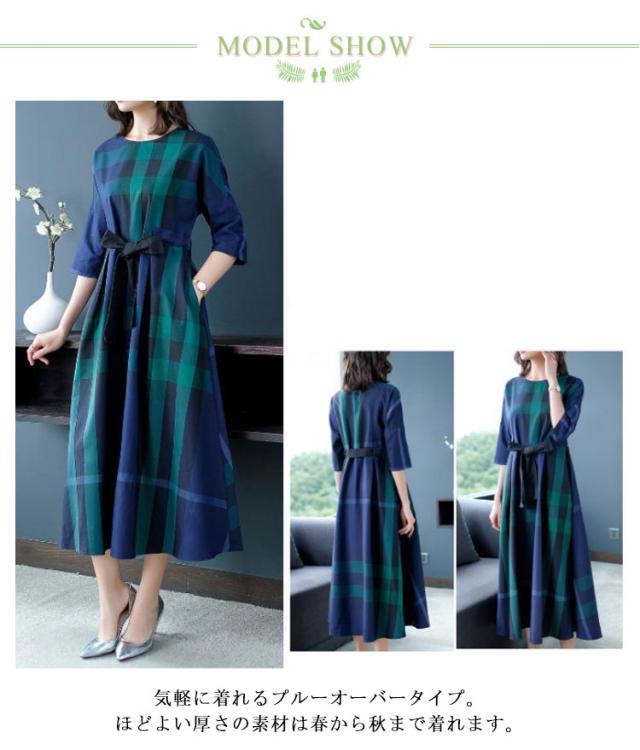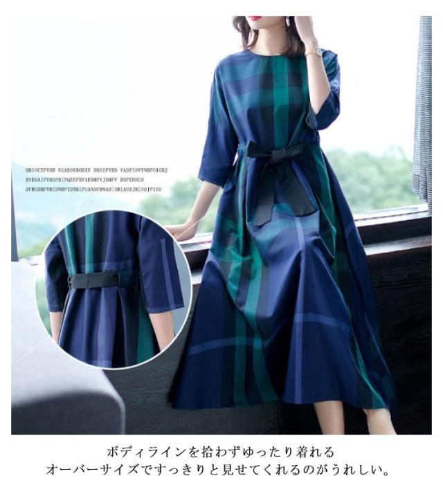 送料無料 チェック ワンピース レディース ロングワンピース チェック柄 Aライン ウェストリボン プルオーバー チュニック ワンピース 七分袖 格子柄 着やせ オーバーサイズ ゆったり 大人可愛い マタニティ 春 夏