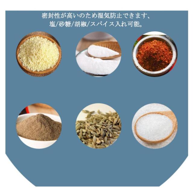 | おしゃれで実用。 長さ調節可能のスプーン付き調味料入れ(2個セット) 密封性が高いのため湿気防止できます、塩/砂糖/胡椒/スパイス入れ可能。 フタと一体になる、伸縮で長さを調節できるスプーン付き。 調味料が満杯になっても気楽に蓋を閉めます。一番下まで届きますので調味料を使い切ることができます。 蓋の間にシリコンリング付き、調味料入れの密封性を高め、空気中の水分の侵入を防止、調味料の乾燥性を維持します。 グラスの部分だけではなく、スプーンやフタなど、全パーツが食品衛生法基準による検査を通過、安心で安全な材質を使用します。 | |