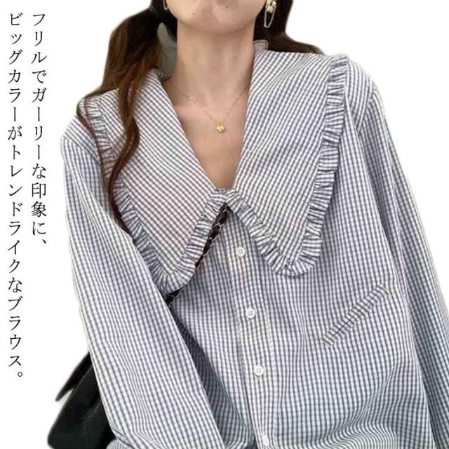 送料無料 ビッグカラー シャツ ブラウス チェック柄 シャツ チュニック ボリュームスリーブ 長袖 襟付き フリル襟 デカ衿 小顔見せ ゆったり ドルマンスリーブ ビッグカラーブラウス 大人可愛い ガーリー