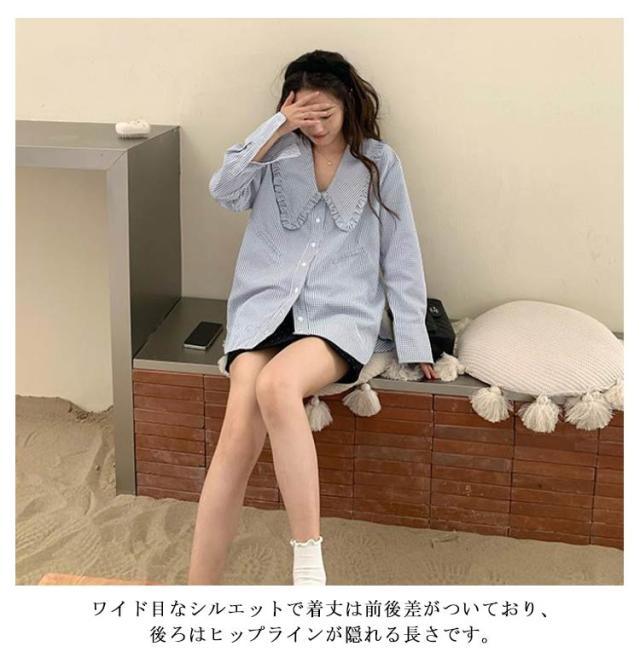| フリルでガーリーな印象に、ビッグカラーがトレンドライクなブラウス。 大きめカラーが大人可愛い。ゆったりシルエットで今っぽさ抜群! 存在感のある細めのチェック柄を柔らかい印象に仕上げてくれます。 ワイド目なシルエットで着丈は前後差がついており、後ろはヒップラインが隠れる長さです。 カーディガンやキャミワンピ、トレンチコートなど襟を出したコーデも可愛く決まる◎ | |