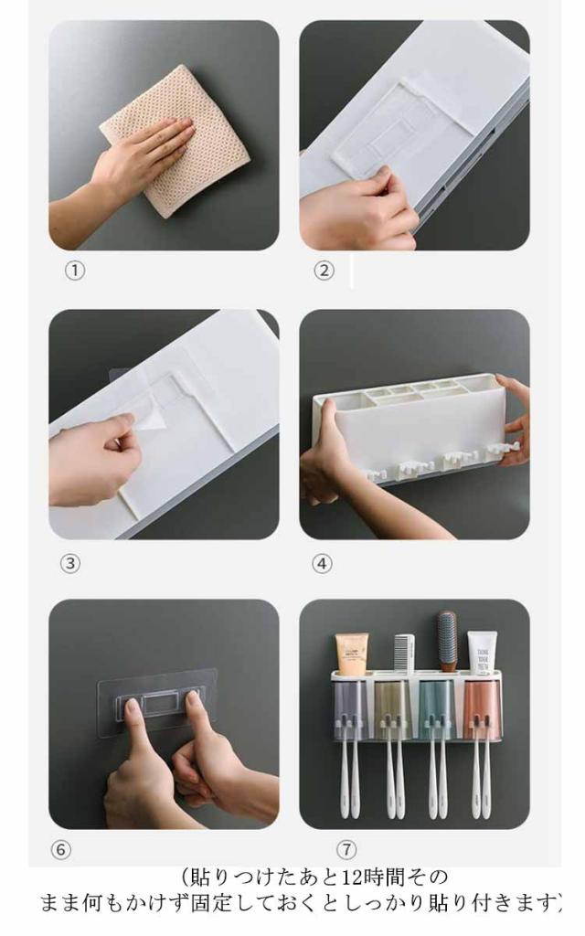 | 歯ブラシ、歯磨き粉、コップなどをまとめて収納でき、洗面所がスッキリ。 吊り下げタイプで水切れもよく乾燥しやすいため衛生的です。 歯ブラシを入れて押すと、自動的に歯磨き粉が絞り出されるので便利です。 浮かせる収納なので洗面台や浴室の掃除も楽ちんになります。 小物収納付きで、歯ブラシ・歯磨き粉・化粧品・くし・コスメ用品・シェーバーなどを置くことができます。 穴開けが不要な粘着テープ付きの貼りつけタイプです。壁を傷つけたり取り外すことなく設置ができます。 (貼りつけたあと12時間そのまま何もかけず固定しておくとしっかり貼り付きます) | |