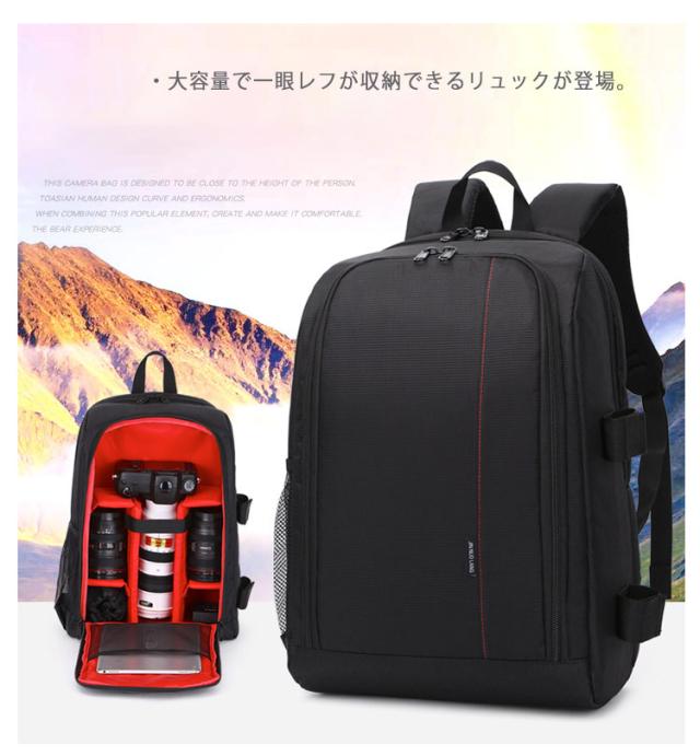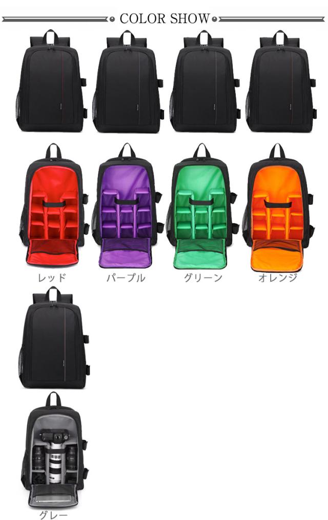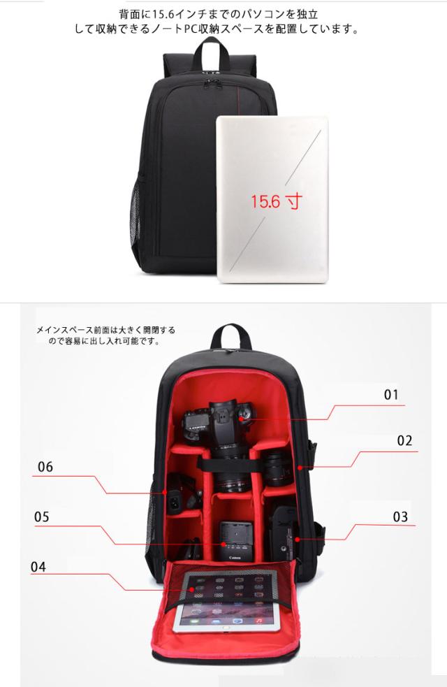 | ・カメラマンや写真撮影が趣味の方にオススメ! ・大容量で一眼レフが収納できるリュックが登場。 ・メインスペースには、機材同士の干渉を防ぐ仕切りが付いています。 ・メインスペース前面は大きく開閉するので容易に出し入れ可能です。 ・背面に15.6インチまでのパソコンを独立して収納できるノートPC収納スペースを配置しています。 ・バッグ側面の片側に、二本のマジックテープ付きベルトを配置し、小型の三脚を固定することができます。 ・また、ドリンクや折りたたみ傘の収納に便利なメッシュポケットが付いています。 ・背面に背中に沿う厚めのクッションを採用し、背中にかかる負担と汗ムレを軽減します。 ・表地はすべて防水加工が施されており、さらにレインカバーが付属していますので、天候を気にせず撮影に出かけることができます。 ・クッション性に優れた内装 ・内部の間仕切りは取り外し可能 | |