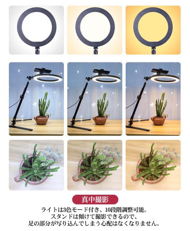 俯瞰撮影 スマホスタンド LEDリングライト付き 真上から撮影 スタンド LEDライト 自撮り 3色モード付き USB 接続 照明ライト 動画 撮影 10段階調整 スタンド 卓上 ライブ配信 美肌効果 リモート テレワーク zoom