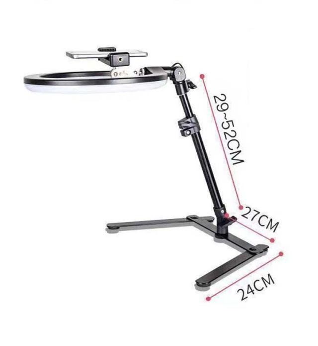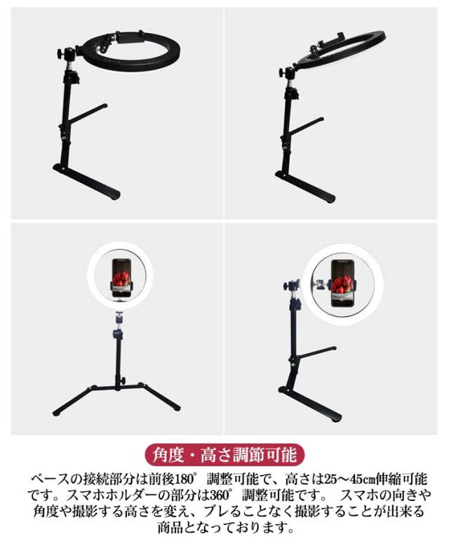 | 【ガッチリ固定】ベースの部分は鋳鉄製のため、適度な重さがあります。またスマホホルダーのバネはスマホを強力に挟んでズレることなくガッチリ固定することができます。 【角度・高さ調節可能】ベースの接続部分は前後180°調整可能で、高さは25〜45cm伸縮可能です。スマホホルダーの部分は360°調整可能です。 スマホの向きや角度や撮影する高さを変え、ブレることなく撮影することが出来る商品となっております。 【真中撮影】ライトは3色モード付き、10段階調整可能。スタンドは傾けて撮影できるので、足の部分が写り込んでしまう心配はなくなりません。 【用途】調理シーンの動画撮影,フリマアプリの商品撮影やセルフィー(自撮り),ゲーム動画撮影、集合写真,勉強,書き物,書道,絵(アート)など | |