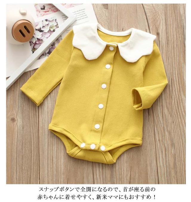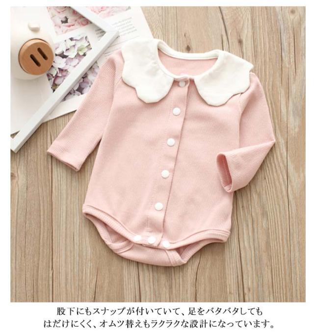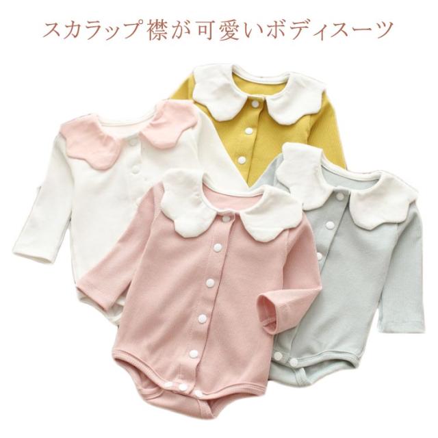 ロンパース ボディスーツ 女の子 ベビー 肌着 下着 リブ ボディシャツ 赤ちゃん スカラップ襟 襟付き 長袖 前開き スナップボタン式 フロントボタン インナー カバーオール コットン素材 おしゃれ 新生児 ギフト 出産祝い 綿 春 全4色