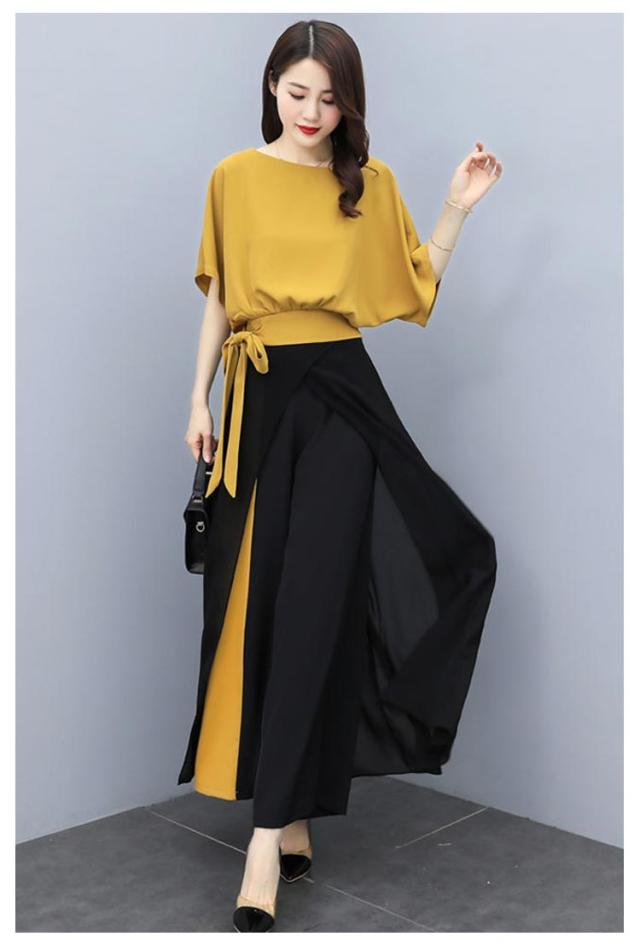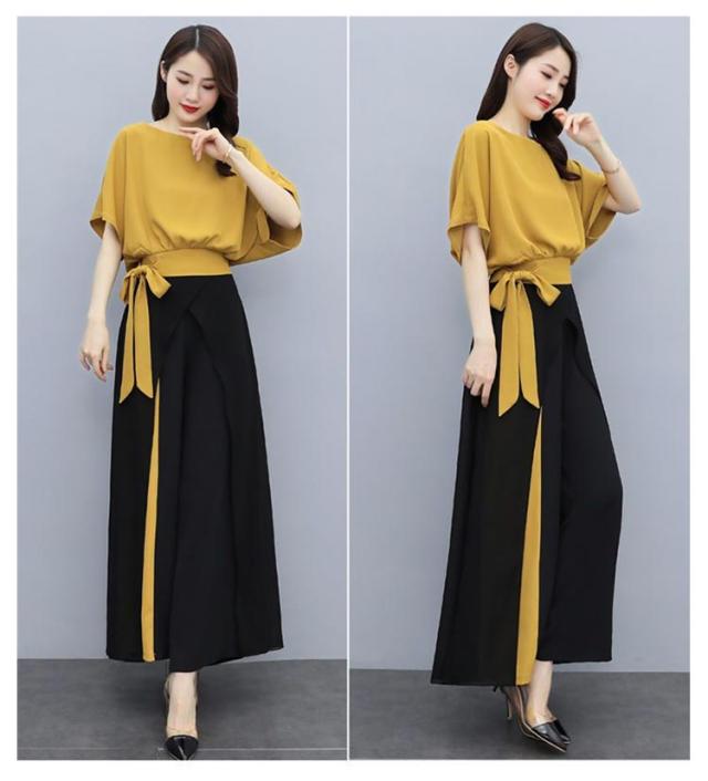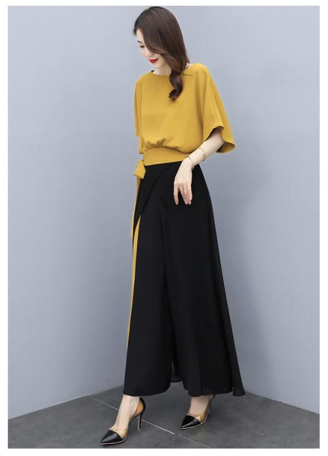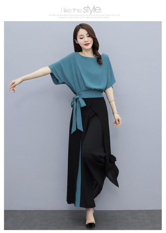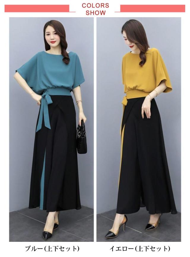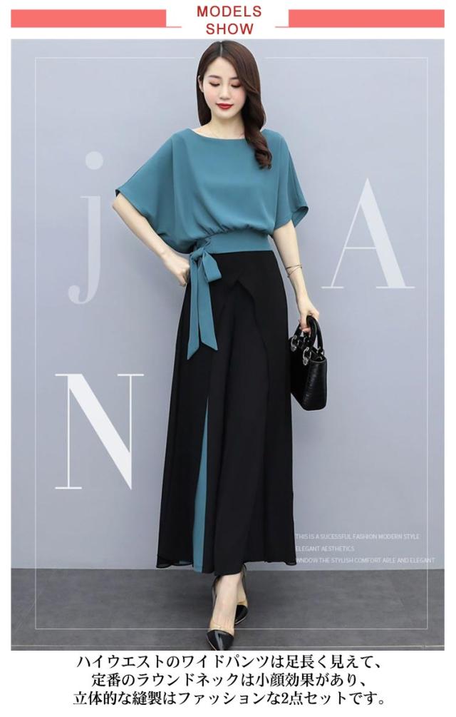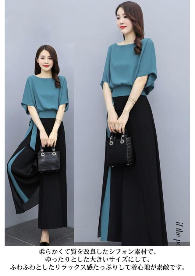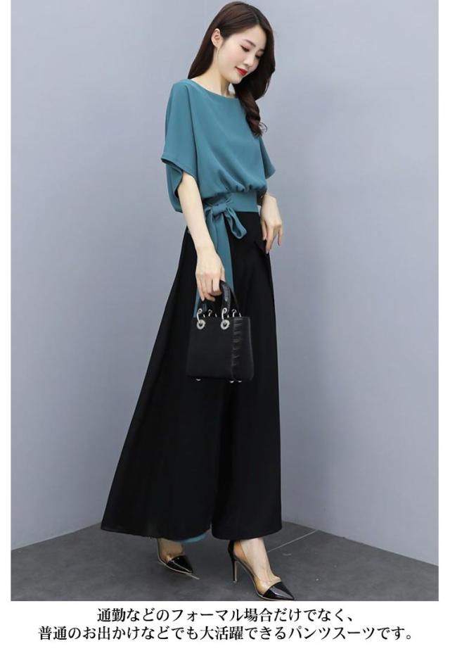 セットアップ レディース パンツスーツ 上下セット カジュアル シフォン 春 夏 2点セット ウエストリボン トップス 半袖 大きいサイズ ワイドパンツ ロング パンツ フォーマル ハイウエスト 上品 30代 40代 通勤 OL きれいめ 着痩せ