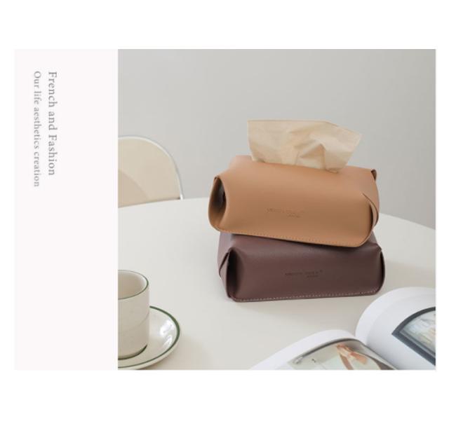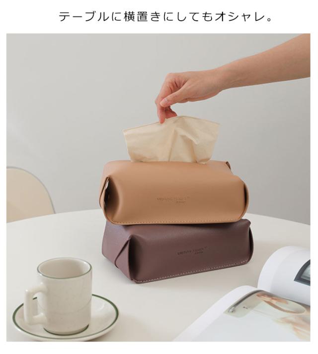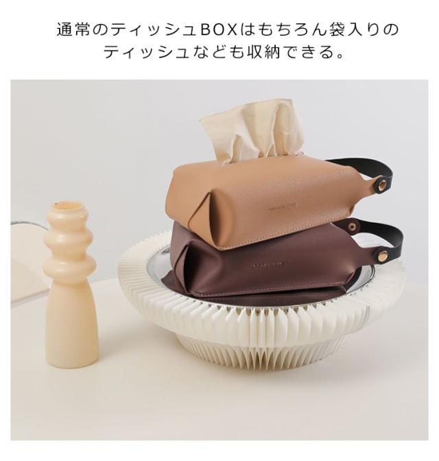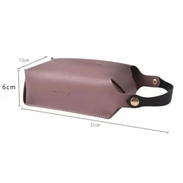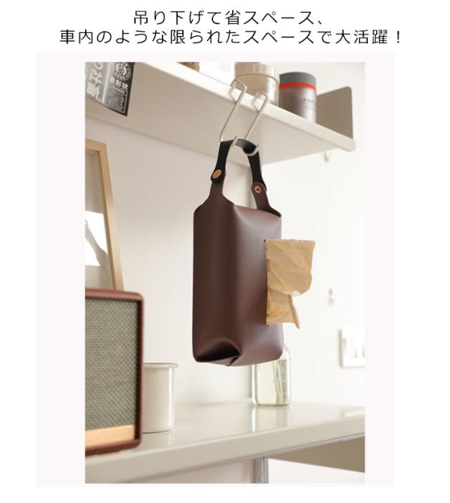 | 掛けられるレザー調ティッシュケースが登場。 テーブルに横置きにしてもオシャレ。 素材はしっとりとした質感の高品質PUレザー。 撥水性に優れ、水がついてしまった場合にはサッと乾拭き。 汚れてしまった場合にも気軽に水拭きが可能です。 吊り下げて省スペース、車内のような限られたスペースで大活躍! ヘッドレストにかけておけば、上に座って箱が潰れてしまうこともなくなります。 通常のティッシュBOXはもちろん袋入りのティッシュなども収納できる。 | |