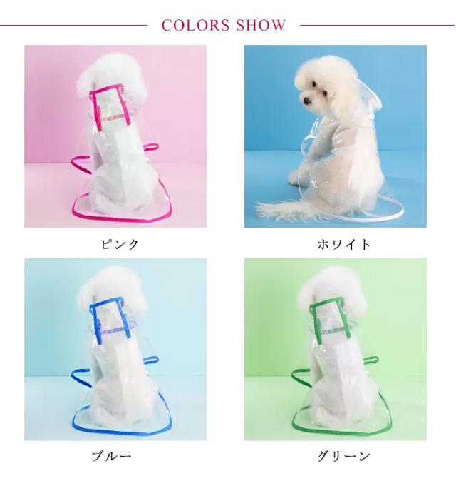 | 大人気の犬用透明レインコート。 安全なプラスチック素材のペット雨具。 着せ易いポンチョタイプ。 雨の日や雨上がりのお散歩に欠かせないアイテム♪ 簡単に装着できる、軽くて、折り畳んで収納できます。 雨の日はもちろん、寒さ対策に、風よけに、そして花粉よけにも、様々な用途で活躍です。 | |