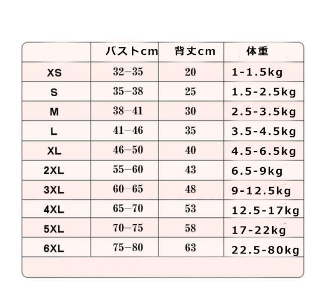 | サイズについての説明 | XS:背丈20cm バスト32-35cm 体重1-1.5kg S:背丈25cm バスト35-38cm 体重1.5-2.5kg M:背丈30cm バスト38-41cm 体重2.5-3.5kg L:背丈35cm バスト41-46cm 体重3.5-4.5kg XL:背丈40cm バスト46-50cm 体重4.5-6.5kg 2XL:背丈43cm バスト55-60cm 体重6.5-9kg 3XL:背丈48cm バスト60-65cm 体重9-12.5kg 4XL:背丈53cm バスト65-70cm 体重12.5-17kg 5XL:背丈58cm バスト70-75cm 体重17-22kg 6XL:背丈63cm バスト75-80cm 体重22.5-80kg |