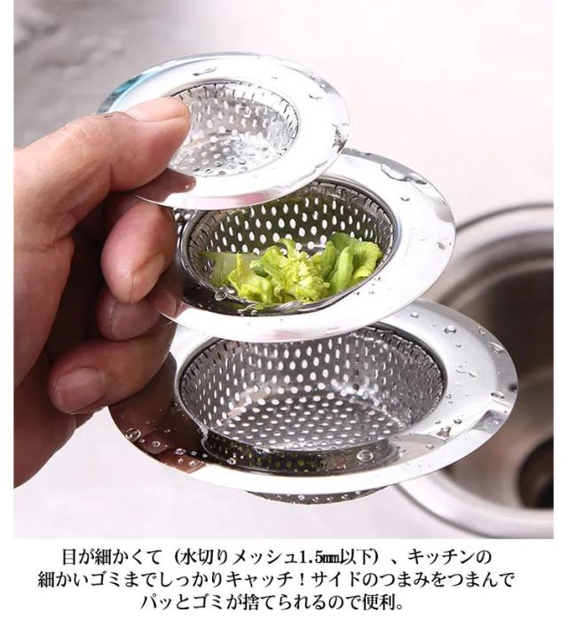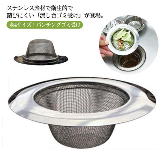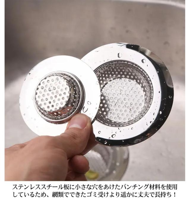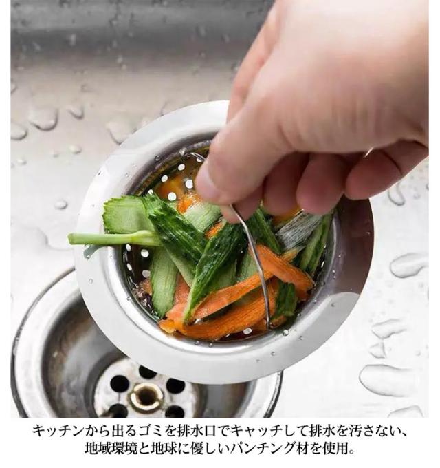 | ・ステンレス素材で衛生的で錆びにくい「流し台ゴミ受け」が登場。 ・シンクの排水口径が3.8cm〜9.5cmまで対応。 ・ステンレススチール板に小さな穴をあけたパンチング材料を使用しているため、網類でできたゴミ受けより遥かに丈夫で長持ち! ・目が細かくて(水切りメッシュ1.5mm以下)、キッチンの細かいゴミまでしっかりキャッチ!サイドのつまみをつまんでパッとゴミが捨てられるので便利。 ・キッチンから出るゴミを排水口でキャッチして排水を汚さない、地域環境と地球に優しいパンチング材を使用。 ・ぬめりが出にくいステンレス素材だから、お手入れもラクラク。 | |