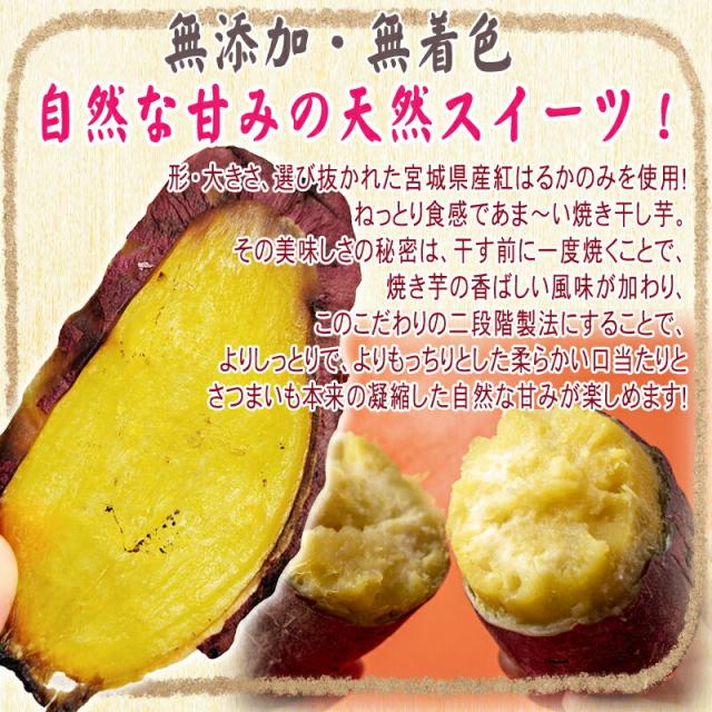 厳選した宮城県産紅はるかを使用した焼き干し芋。自然の甘さが凝縮した、しっとり柔らかくてねっとりとした食感がたまりません。皮付のまま食べられるので、焼き芋の香ばしい風味も楽しめます。着色料・調味料等一切使わず、安心・安全の無添加。「紅はるか」ならではの自然な甘みが堪能できます。小さいお子様からご家族皆様でお召し上がる他、プチギフトなどでも喜ばれます!