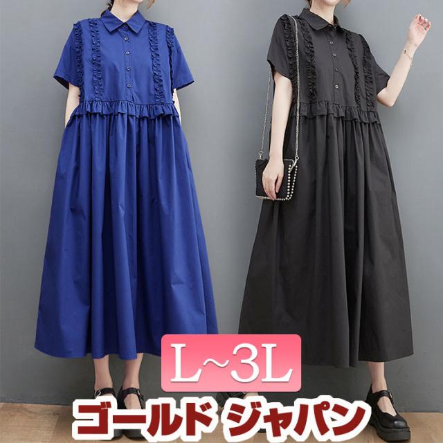 春新作 大きいサイズ レディース ワンピース フリルシャツワンピース ワンピ ロングワンピース シャツワンピース ロング マキシ 膝下 フリル フレア Aライン シャツ ボタン ポケット コットン 半袖 無地 夏服 冬服 F フリー L LL 2L 3L ブルー ブラック 黒 ゴールドジャパン