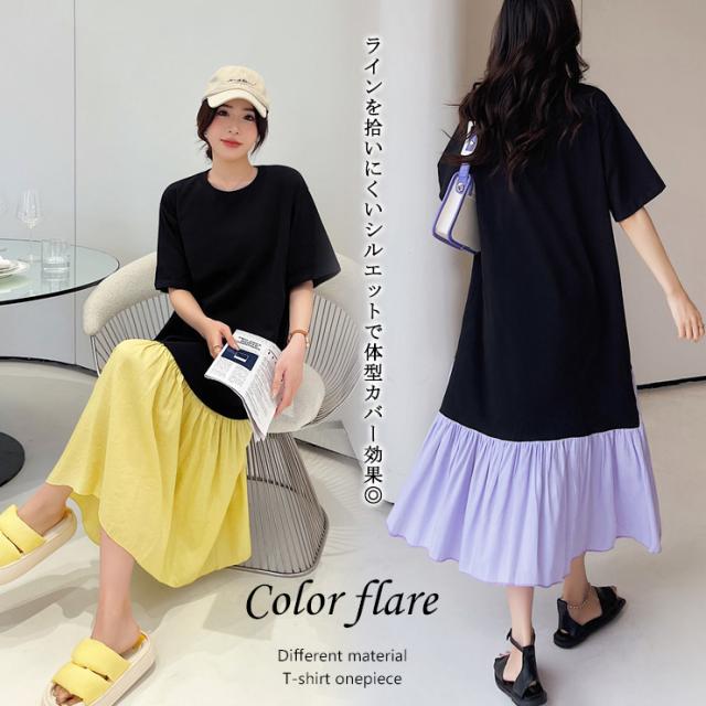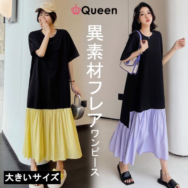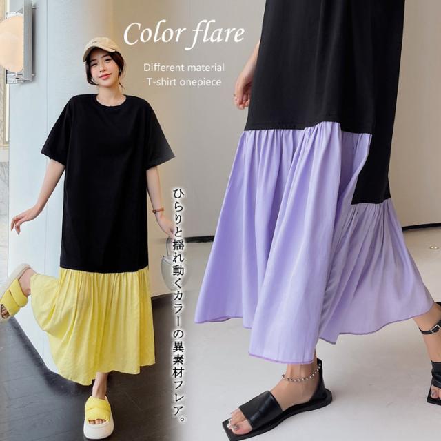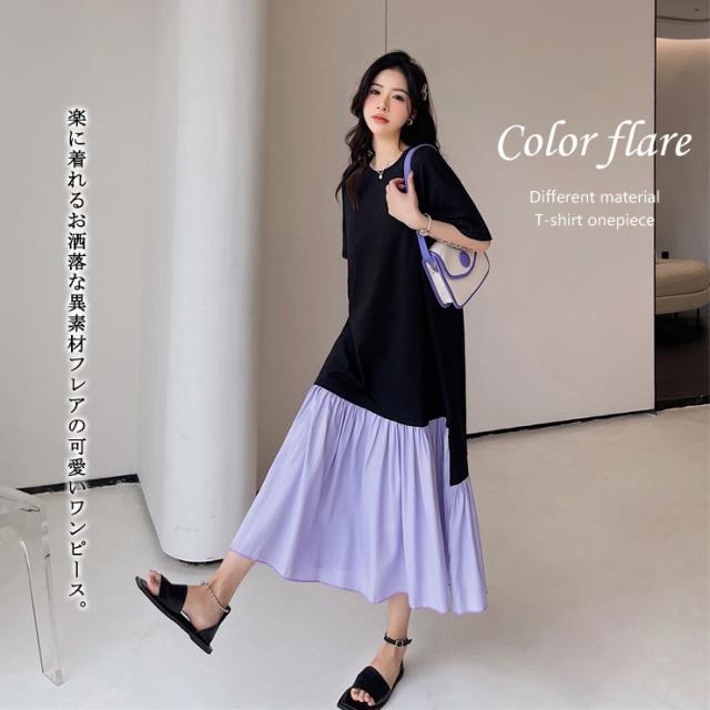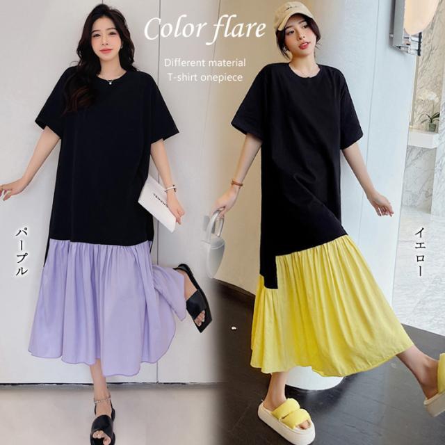 ★☆大きいサイズレディース Tシャツワンピース ドッキング バイカラー 半袖 黒 異素材 夏 3L 4L 5L 6L パープル イエロー 新入荷 メール便可☆★