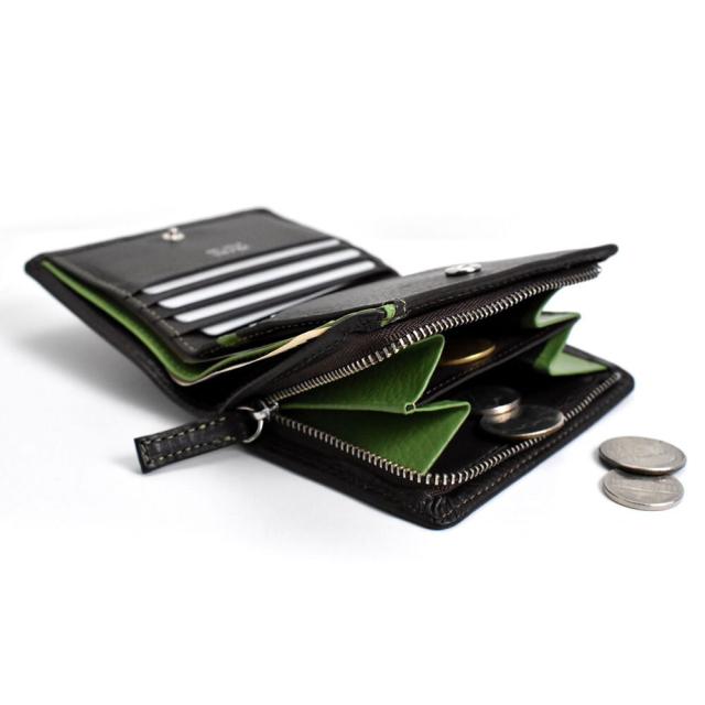 小銭室がファスナー仕様の二つ折り財布。通称ミドルウォレット。