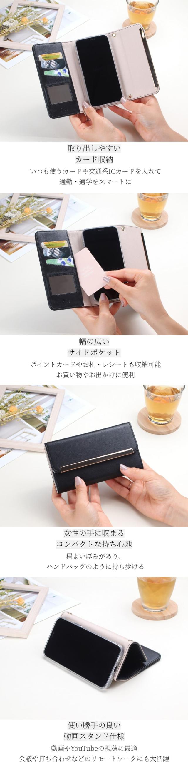 手帳型ケースはマットなフェイクレザーを採用し、キズや汚れが目立ちにくいのが特徴です。