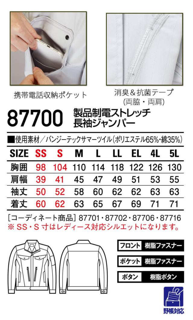 自重堂 Jichodo 製品制電ストレッチジャンパー 87700 長袖 作業着 作業服 春夏 ブルゾン ユニセックス SS〜EL