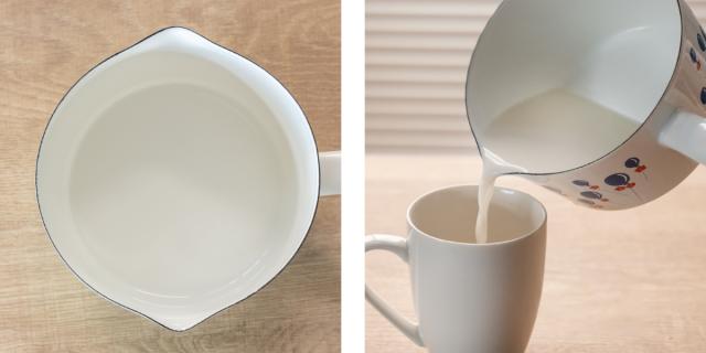 両サイドに注ぎ口が付いているので利き手に関係なく使用でき、温めたミルクやスープを器に注ぐのに便利です。