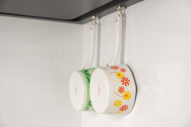 取っ手には穴があるので、フックなどに掛けて収納できます。
