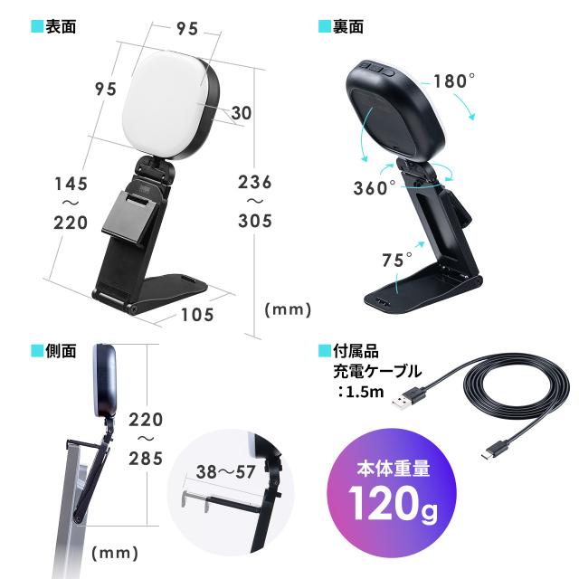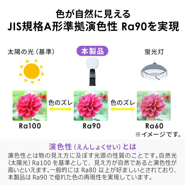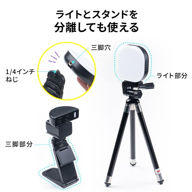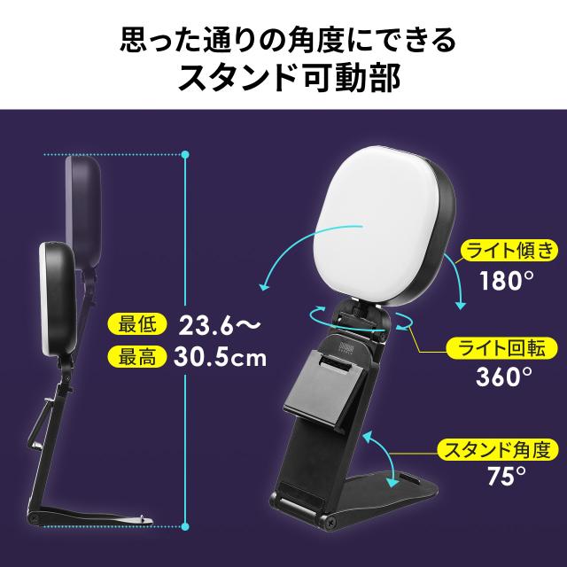⇒ご購入の前にご確認下さい色温度を5段階、明るさを5段階で調整可能。動画配信やオンライン会議など様々な場面で使用できるLEDライト。モニターにかける、スタンドとして置く、スマホを設置して使用もできる3WAYLEDライト。240ルーメン。演色性Ra90。【WEB限定商品】