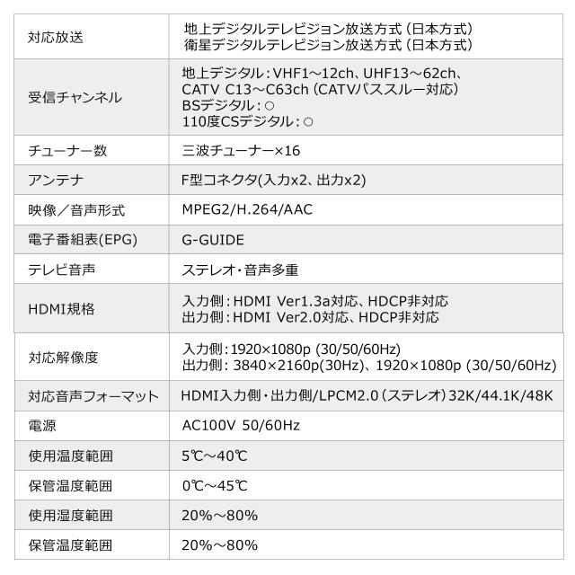 地上デジタル:VHF1〜12ch、UHF13〜62ch、CATV C13〜C63ch(CATVパススルー対応)