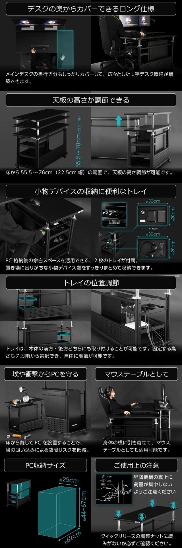 お使いのデスクと合わせて使うことでL字デスクの作業スペースを実現できる拡張型昇降式L字デスク。収納部にはPC本体も格納でき、パソコンカートとしてもお使いいただけます。