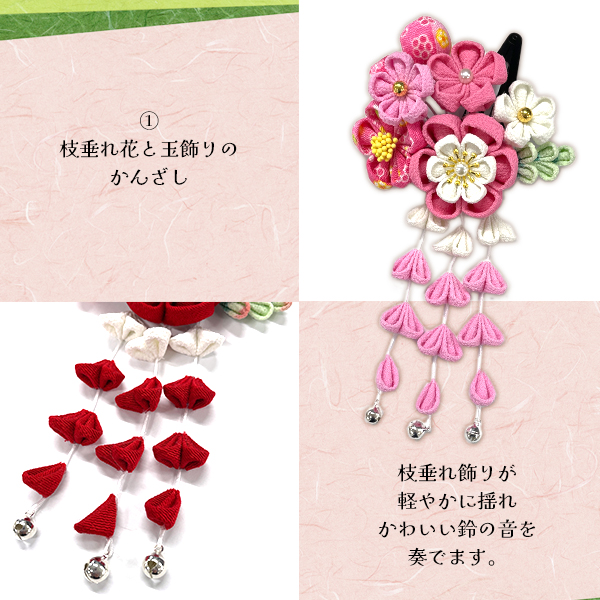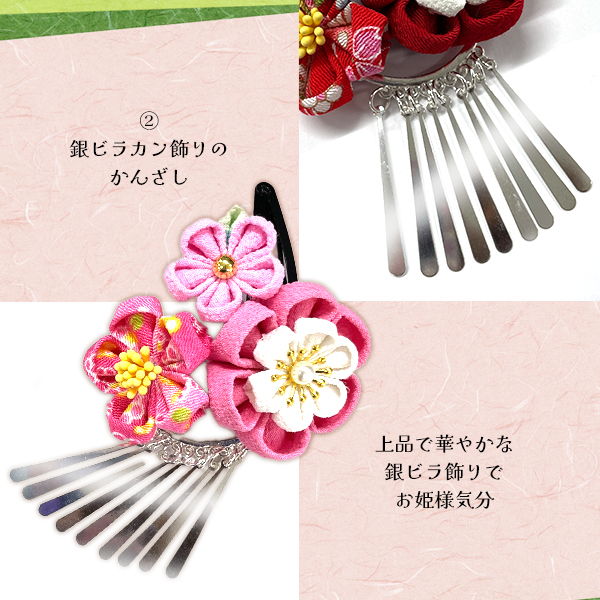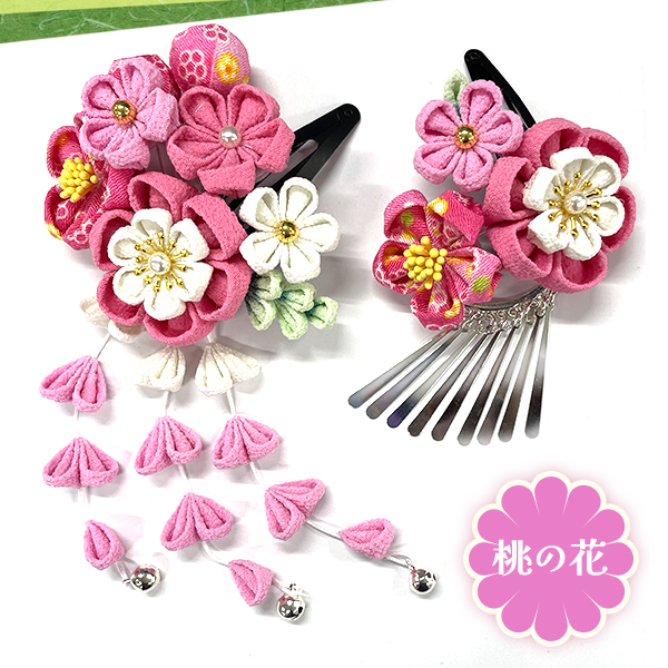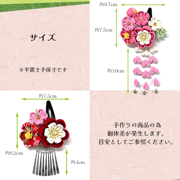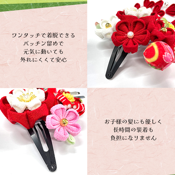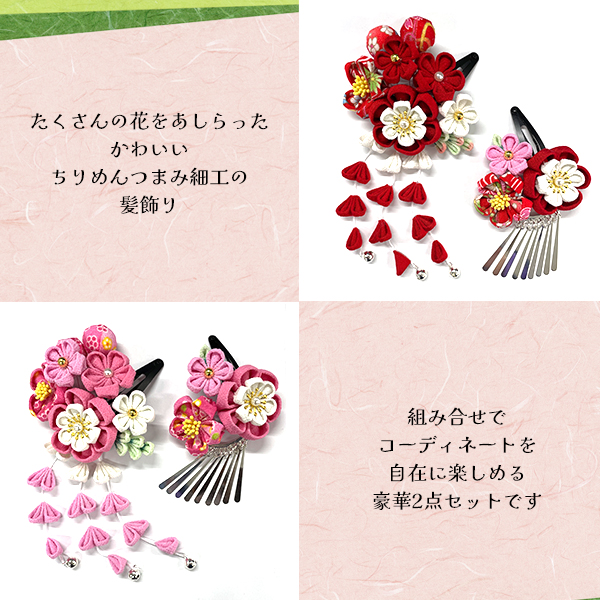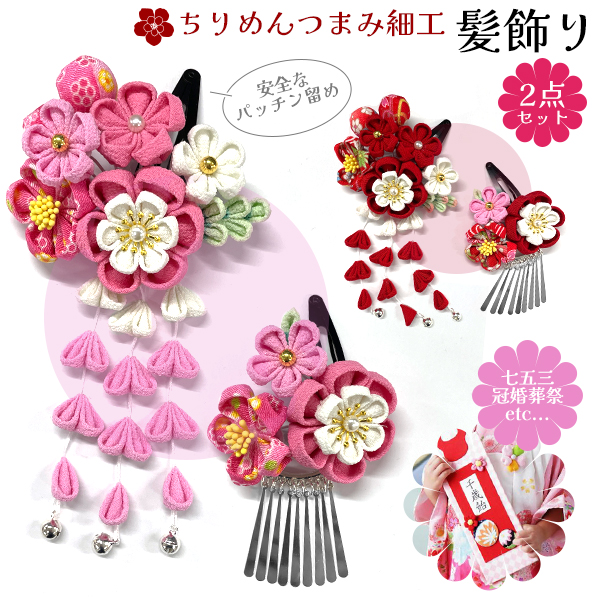 【最安値挑戦中!】ちりめん つまみ細工 髪飾り かんざし 2点セット 七五三 パッチン留め 着物 袴 和装 3歳 5歳 7歳 節句 卒業式 卒園式 お正月 ひな祭り フォーマル キッズ 女の子 赤 ピンク 桃 花 桃 梅 藤 銀ビラ 枝垂れ 藤下がり スリーピン ネコポスで送料無料!