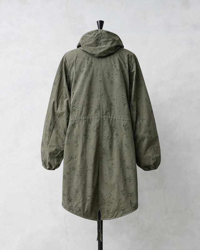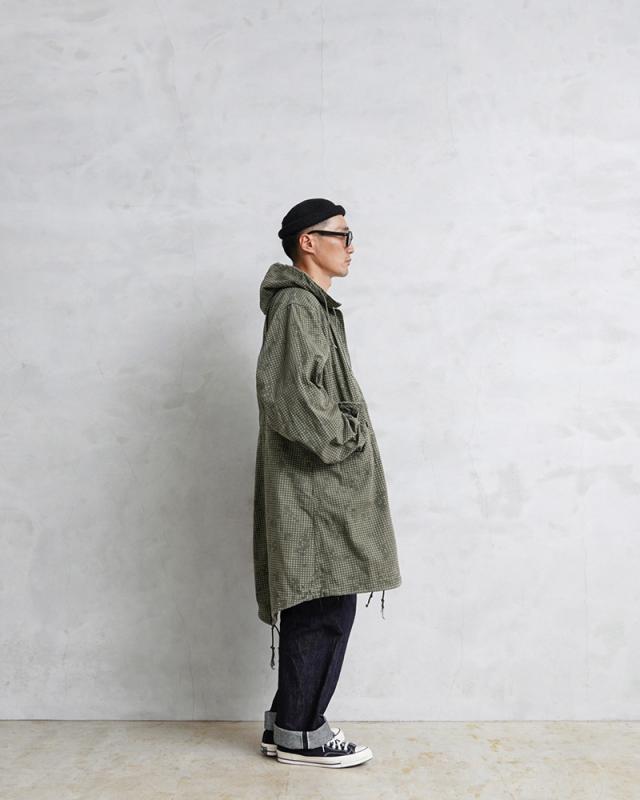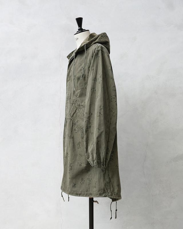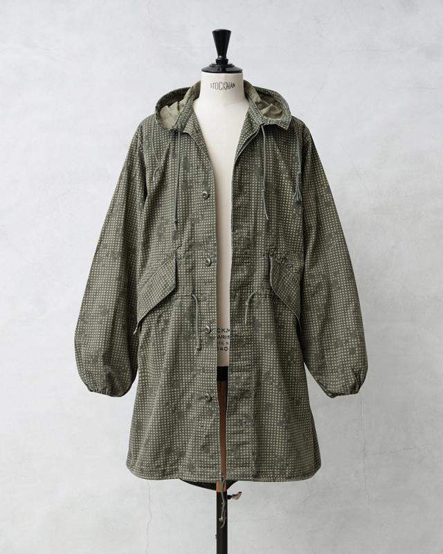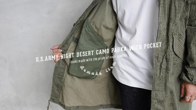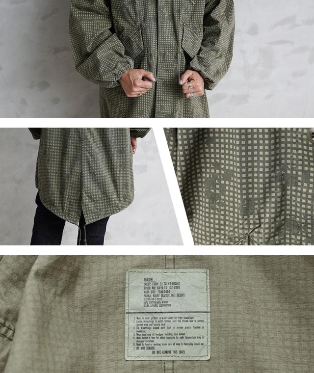 ナイトデザートカモ柄の夜間戦闘用シェルパーカーは本来、暗視装置から発見されにくくするために開発されたパターンで、湾岸戦争時に米軍が使用した2色の格子迷彩柄です。通常、サイドポケットは貫通式のオーバーコートですが、今回はサイドポケットにオリーブカラーの内袋をつけることで収納力をプラスして、羽織りとして使用可能なデザインにリメイクを施し、機能性を高めました!米カリフォルニア州モハーヴェ砂漠をモデルに開発された6カラーデザートカモ(チョコチップカモ)のデザートバトルドレスユニフォーム(DBDU)の上から着用するように設計されていますので、MEDIUMサイズでも日本サイズでXL相当のサイズになり、モッズコート感覚でゆったりと着用していただけます。年々入手困難になってきた希少アイテムを贅沢に使用したスペシャルなリメイクアイテムです!