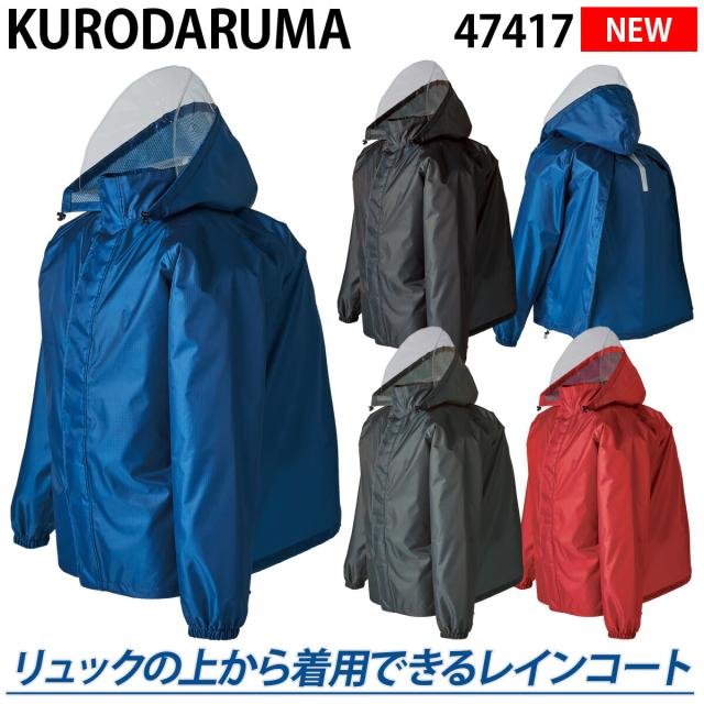 2023年新商品 クロダルマ バックインレインコート 47417 リュックの上から着用できる! 耐水圧10,000mm 軽量 反射素材 着脱式フード 内側総メッシュ 袖ゴム 反射プリント カッパ 通学 通勤 作業着 作業服 KURODARUMA