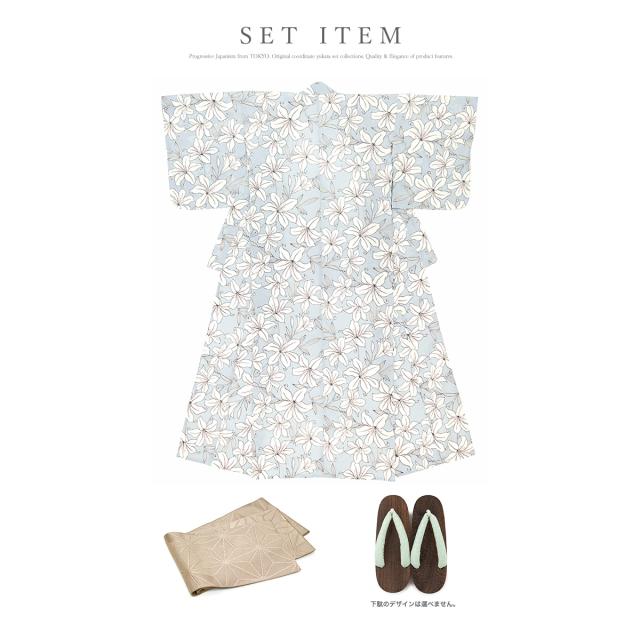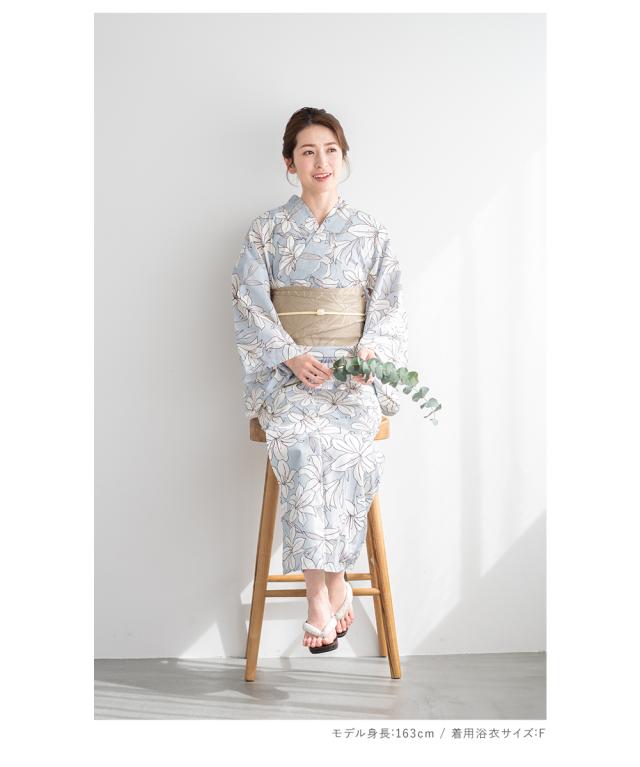 浴衣 セット レディース 浴衣セット 半幅帯 大人 2024 3点セット 水色系 ライトブルー 百合 ユリ 花 ベージュ S フリー 30代 40代 50代 ママ 送料無料